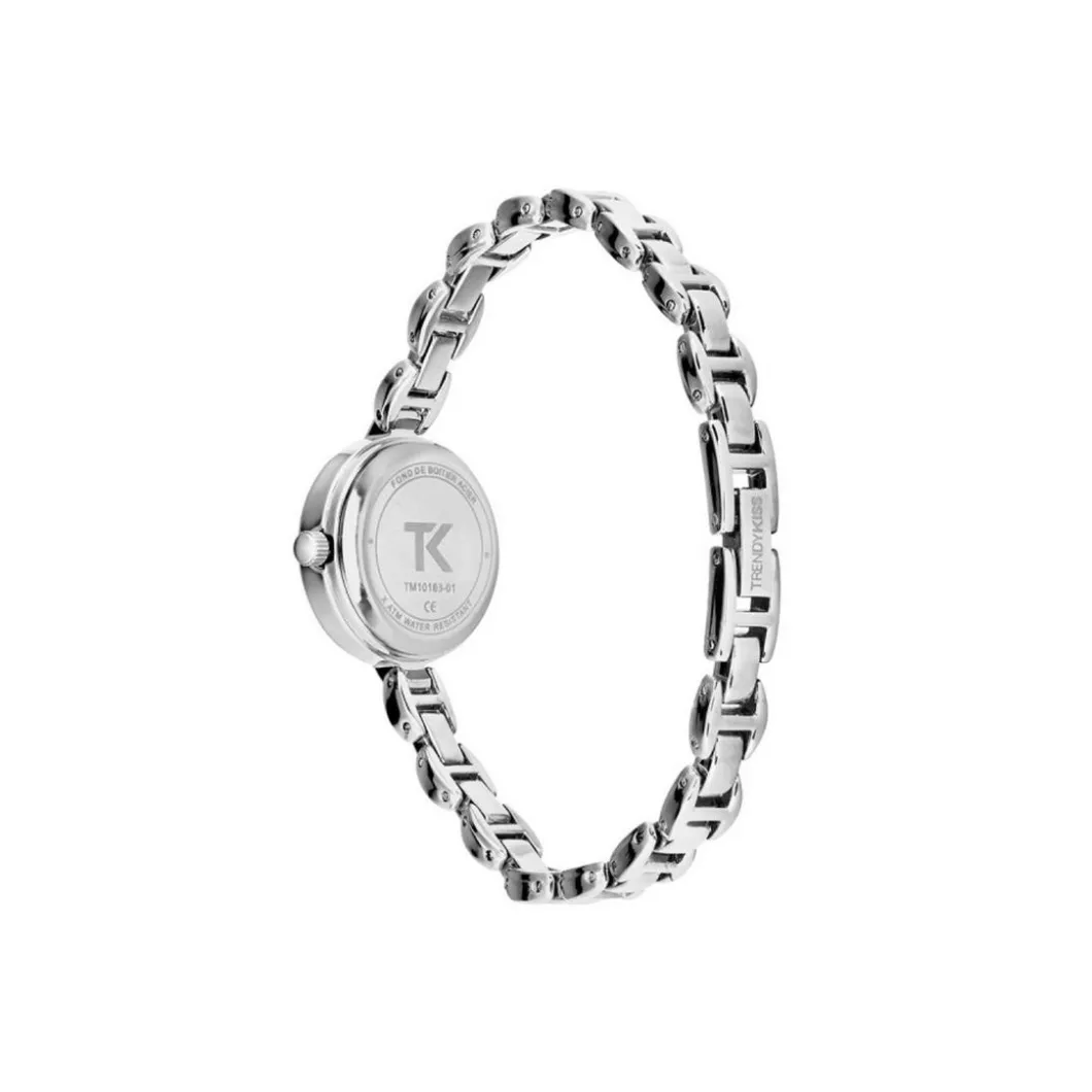 Découvrez la montre pour femme par excellence avec la Trendy Kiss Angèle TM10163-01. Sa forme ronde donne une silhouette féminine, tandis que le boîtier de 24 mm en métal argenté ajoute une touche d’éclat. Le bracelet en acier argent parfaitement assorti renforce le côté raffiné de cette montre. L’affichage analogique est parfaitement protégé par un verre minéral résistant. Son mouvement à quartz assure une précision indéniable. Etanche jusqu’à 30 mètres (3 ATM), cette montre accompagnera les femmes modernes et élégantes dans toutes leurs activités quotidiennes. Les détails de la montre ne sont pas visibles sur l’image fournie.