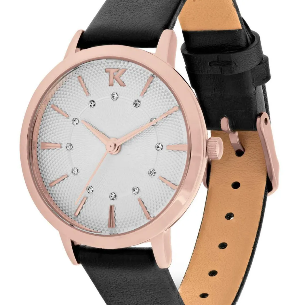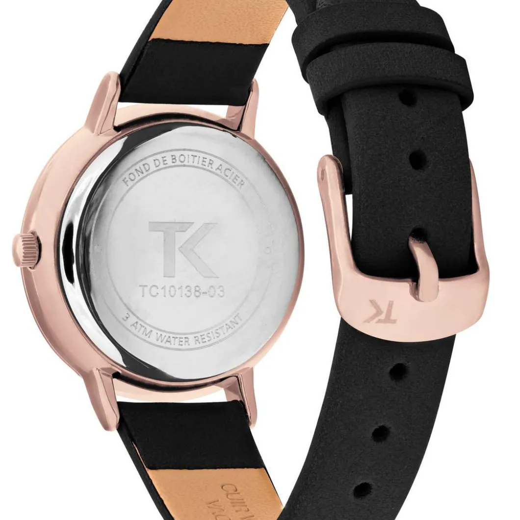 Laissez-vous charmer par la classe indémodable de la Montre Femme TC10138-03 – Trendy Kiss Lise . Son bracelet en cuir noir résistant réhausse son côté élégant. Son cadran blanc est mis en valeur par des aiguilles et index rose dorés, assortis au boîtier en acier.