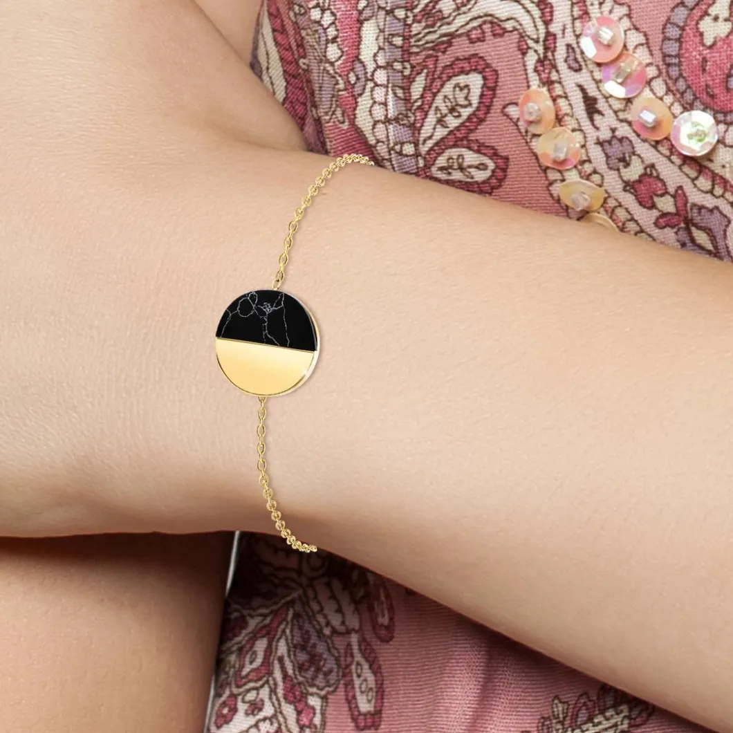 Démarquez-vous des autres avec ce Bracelet Femme B2422-DORE – Angèle M. Cet accessoire original arbore une chaine jaseron fine rehaussé d’un pendentif circulaire bicolore.