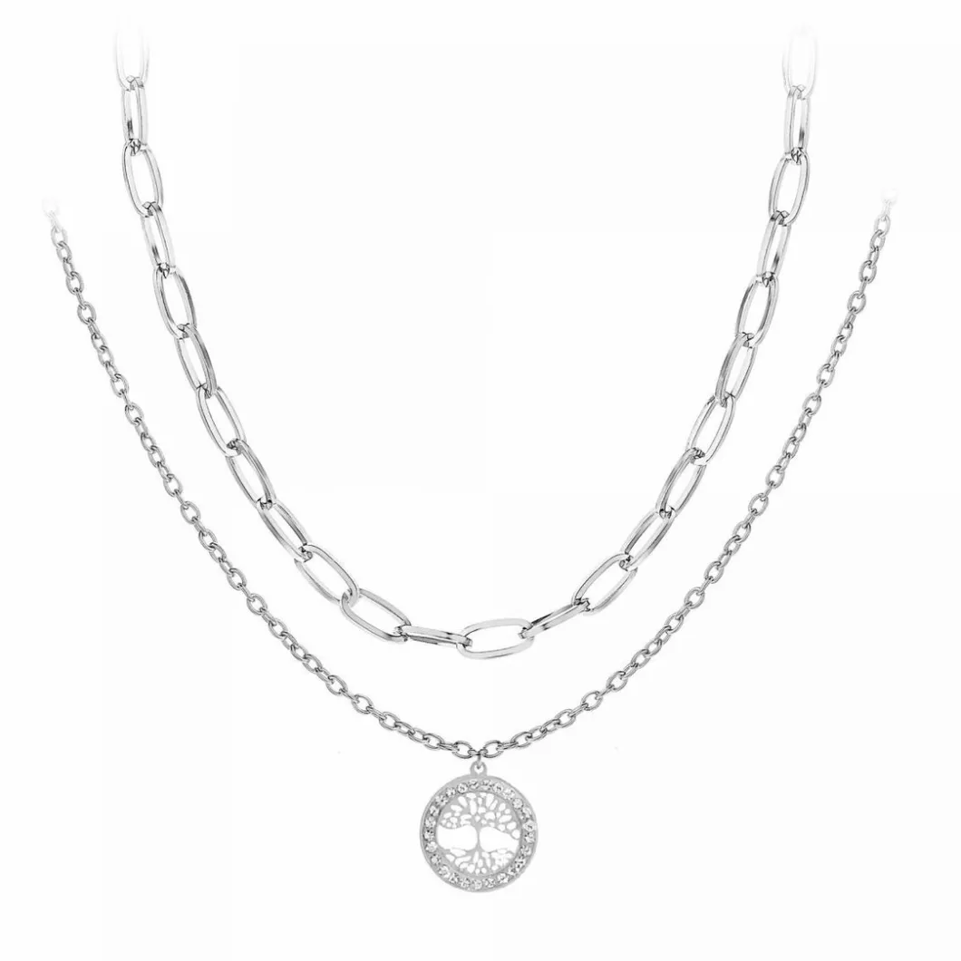Le lot de 2 Collier femme B2559 – Angèle M met merveilleusement votre décolleté en valeur. La chaine en mailles larges agencées en forçat apporte une touche de caractère. Plus fin et délicat, le deuxième bijou se compose d’une chaine en maille forçat portant un pendentif arbre de vie aux finitions somptueuses.