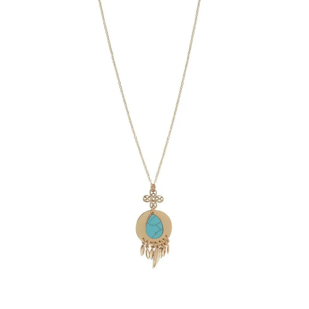 Succombez au charme et à la féminité de ce Collier Femme Bérénice BE0150D – Métal Doré. Il plaît par sa fine chaîne arborant un pendentif avec des breloques en forme de plumes, une pierre turquoise ornant son centre et un support très fantaisiste.