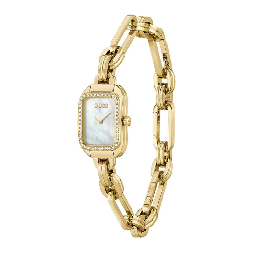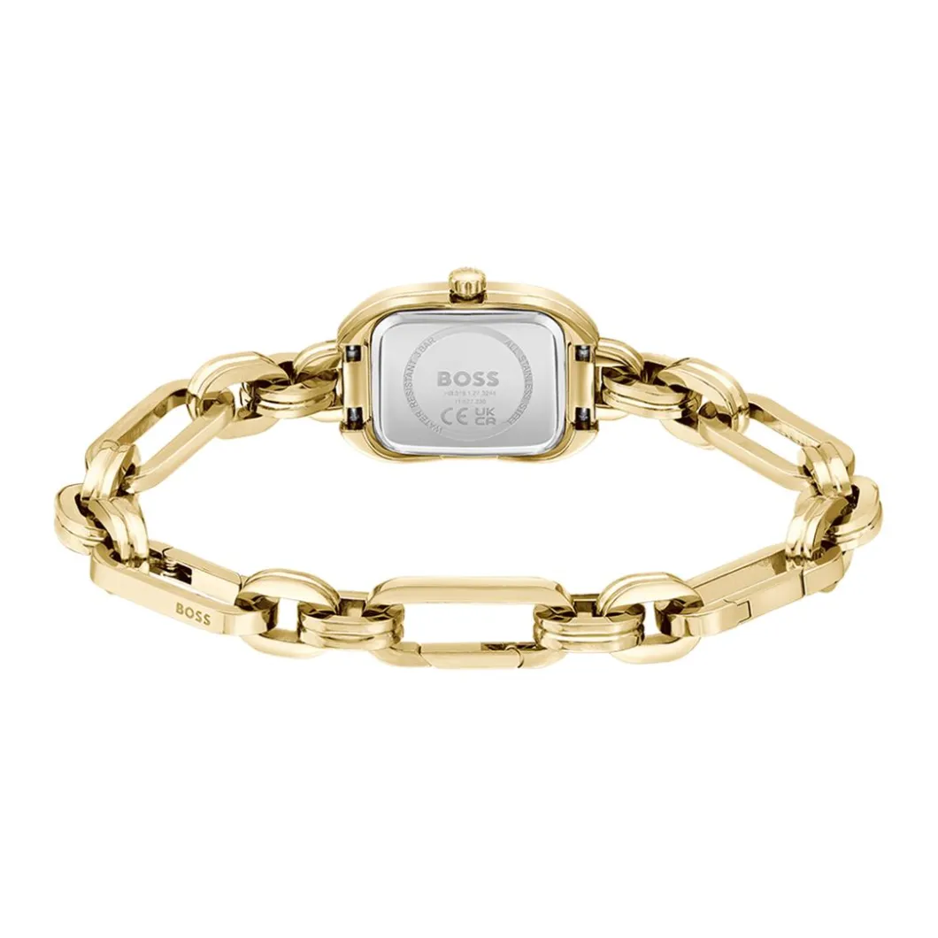 Le style raffiné et sophistiqué de la Montre Femme Boss Hailey – 1502740 de la marque Hugo Boss se remarque au premier coup d’oeil. Sa forme rectangulaire unique dénote une approche originale. La couleur dorée du boîtier et du bracelet donne un aspect luxueux. Fabriquée à partir d’acier de haute qualité, elle est dotée d’un mouvement à quartz pour une précision optimale. La résistance à l’eau est de 30 m. Le verre minéral protège le cadran tandis que la boucle déployante garantit un ajustement sûr. L’affichage est analogique pour un look classique intemporel.