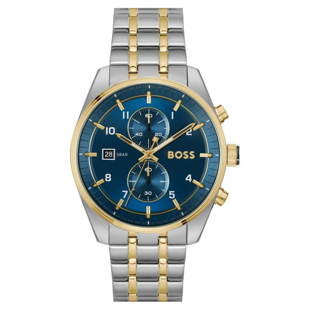 La Boss Skytraveller – 1514247 est un bijou d’élégance réservé aux hommes. Sublimée par un boîtier de 44 mm en acier doré, cette montre présente un affichage analogique sous un verre minéral robuste. Son bracelet en acier Argent est sécurisé par une boucle déployante et confère une allure masculine à l’ensemble. Outre sa fonctionnalité de chronographe, son étanchéité est garantie jusqu’à 50m. Animée par un mouvement Quartz, cette pièce brille par sa fiabilité et sa précision. Le boîtier rond permet une lecture facile de l’heure tandis que le contraste entre le doré et l’argent ajoute une touche de sophistication. Elle est l’accessoire idéal pour parfaire une tenue raffinée.