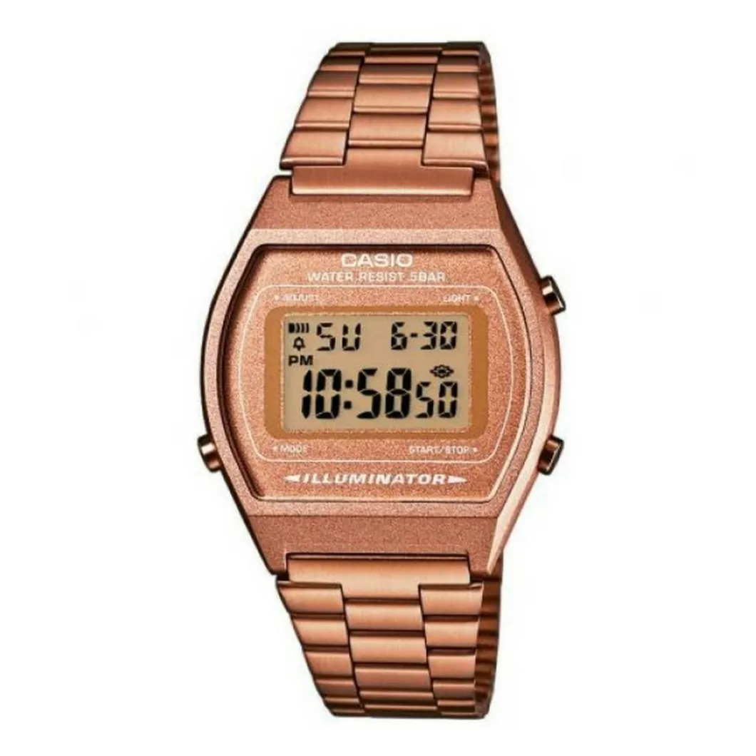 Cette montre captivante Casio B640WC-5AEF appartient à la collection Rétro Vintage. Elle est entièrement réalisée en acier plaqué or rose. Le cadran à affichage digital souligne la présence d’une alarme et d’un dateur avec affichage jour. Idéale pour une personne classique et élégante.
