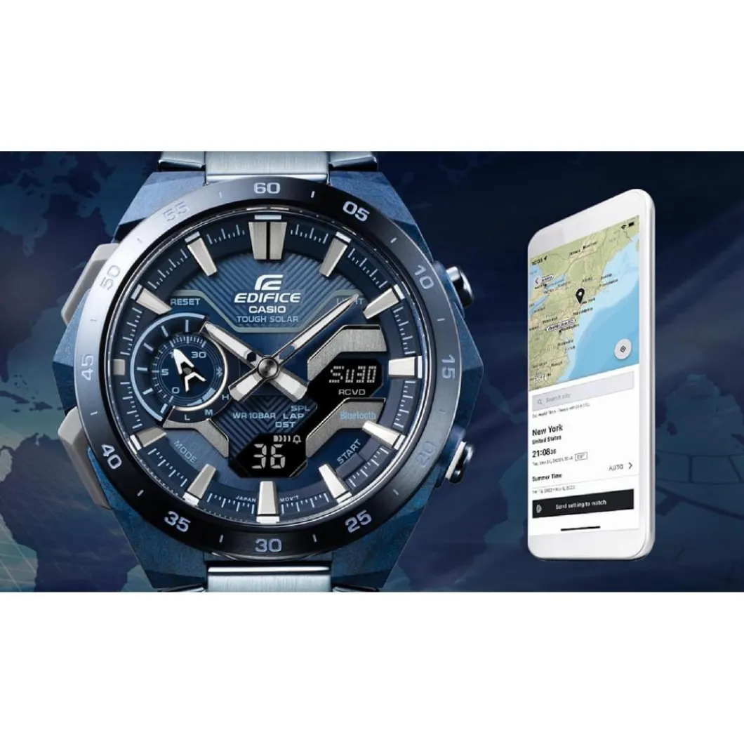 La Casio ECB-2200CB-2AEF Edifice Bluetooth est une montre masculine impressionnante, avec un boîtier rond en acier bleu vif d’un diamètre de 48 mm. Le design est complété par un bracelet en acier de la même couleur bleue. L’affichage digital offre une grande lisibilité. Le mouvement quartz certifie sa précision. Sa résistance à l’eau de 100 mètres la rend idéale pour les activités nautiques. Elle présente une fermeture de boucle déployante, garantissant une sécurité optimale. Le verre minéral protège le cadran des égratignures. La technologie Bluetooth intégrée ajoute une touche high-tech à ce modèle robuste et élégant.
