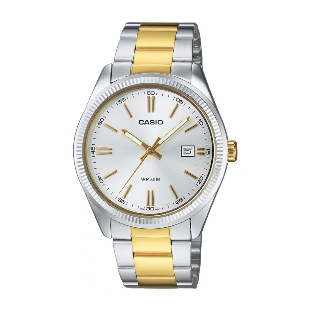 Voici la Montre Homme Casio MTP-1302PSG-7AVEF. Son design, alliant avec efficience modernité et vintage, ne laissera personne indifférent. Son bracelet élaboré en acier inoxydable argenté et doré introduit avec élégance un boîtier au cadran assorti. Une fonctionnalité dateur des plus utiles souligne le pragmatisme de cette montre signée Casio.