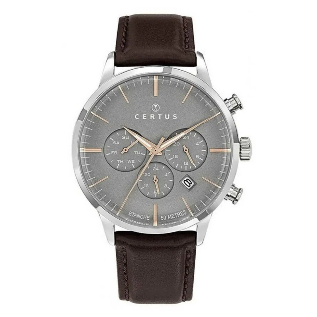 La Montre Homme Certus 611139 présente un design chic et intemporel. Elle présente un boîtier rond et d’une lunette en verre minéral légèrement bombée qui la rend originale. Elle se munit d’un cadran gris clair qui met en valeur les aiguilles dorées. Très pratique, elle réunit plusieurs fonctions dont un affichage analogique classique, un dateur et un calendrier. Le tout se présente sur un superbe bracelet en cuir marron qui complète tout son charme.