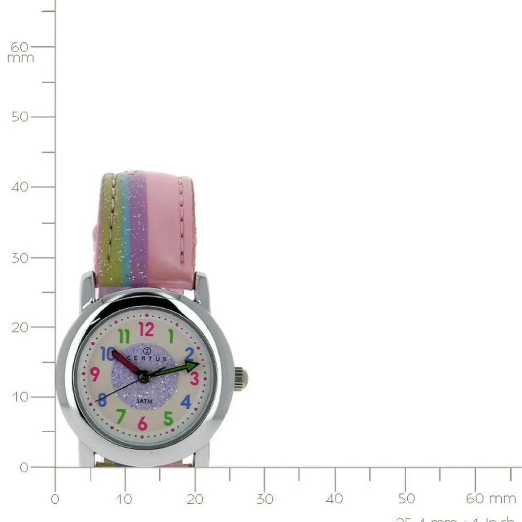 La marque Certus vous présente une montre junior pour fille, qui possède un mouvement quartz analogique, un boîtier en acier inoxydable, un bracelet de matière synthétique