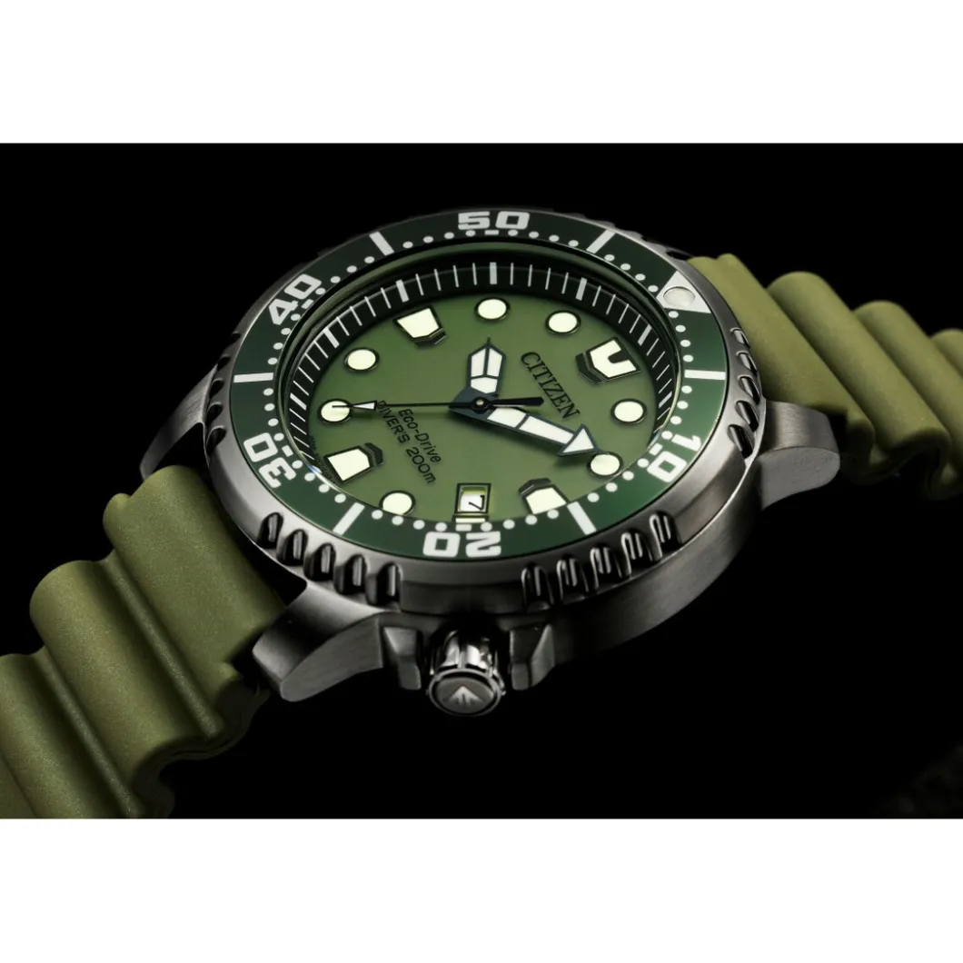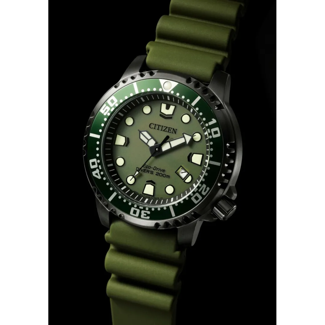 Cette Montre BN0157-11X CITIZEN PROMASTER combine un bracelet vert à boucle ardillon et un boîtier circulaire avec une lunette graduée. Elle s’accompagne d’un cadran vert analogique doté d’un dateur. Cet accessoire propose une étanchéité de 20 ATM.