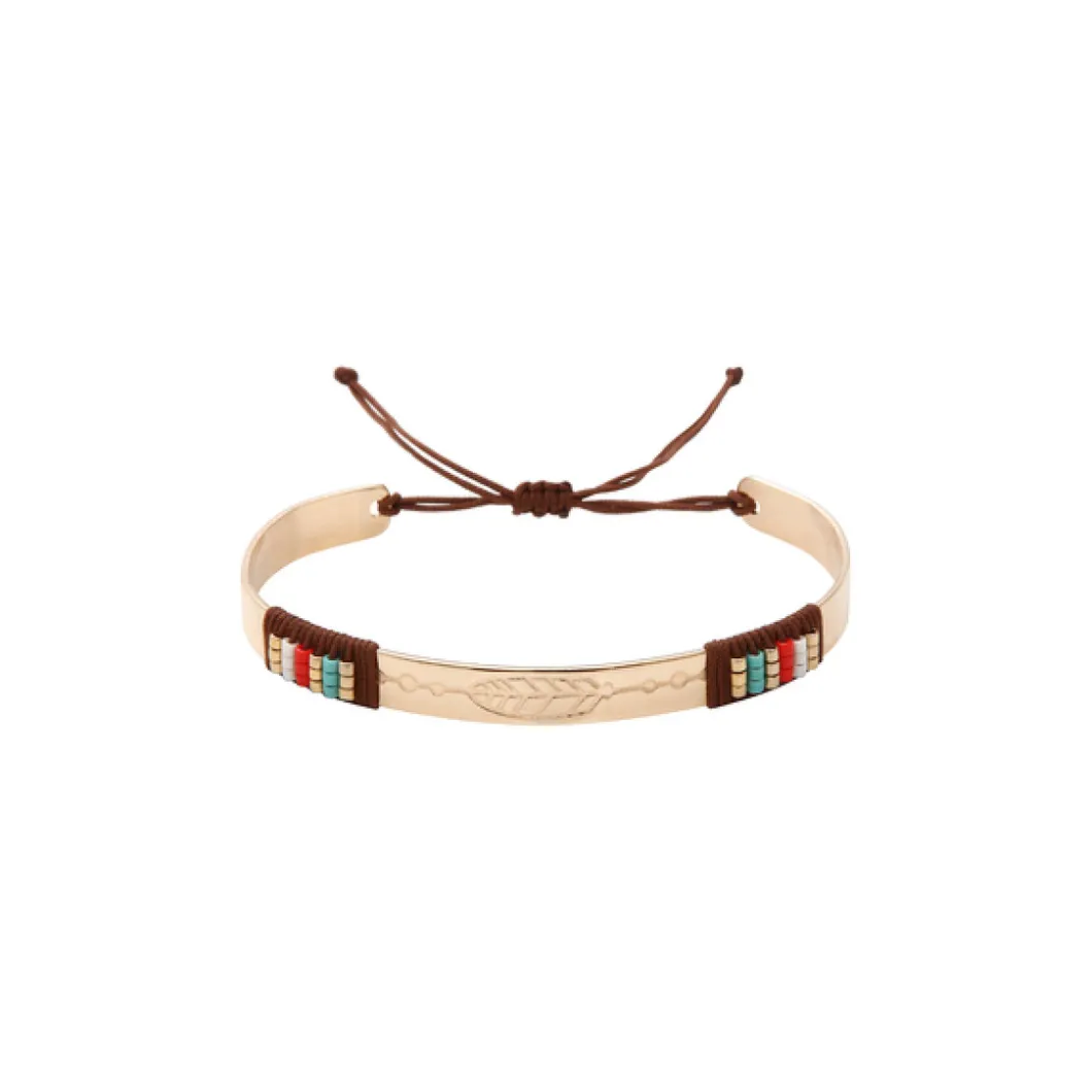 Il se démarque par ses cordons ornés de pierres multicolore et ses gravures originales. Le tout est présenté sur un jonc en laiton doré qui illuminera votre poignet avec style. Le lien à nouer lui sert de fermeture pour faciliter sa manipulation.
