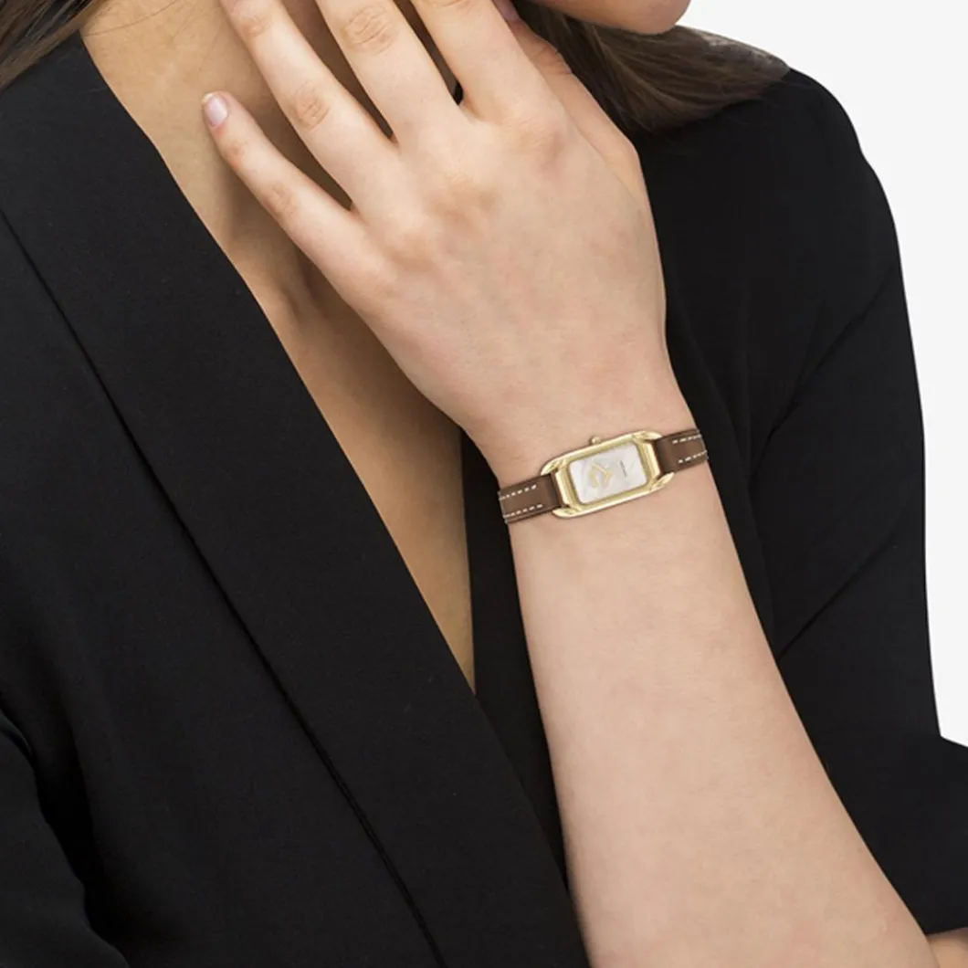 Découvrez la douce sophistication de la Montre Femme Coach Cadie – 14504028. Cette montre pour femme, de marque reconnue Coach, est ornée d’un boîtier rectangulaire doré de 18 mm, fabriqué en acier durable. Elle dévoile un affichage analogique clair et simple, sous un verre minéral résistant. Le bracelet, de couleur marron, est en cuir véritable pour une longévité et un confort inégalé. Son mouvement Quartz assure une précision fiable. La montre offre également une étanchéité jusqu’à 30 mètres, au cas où vous vous retrouveriez prise sous une averse. Elle se fixe facilement grâce à une boucle simple mais robuste. Le design chic et élégant de cette montre vous garantit une allure contemporaine.