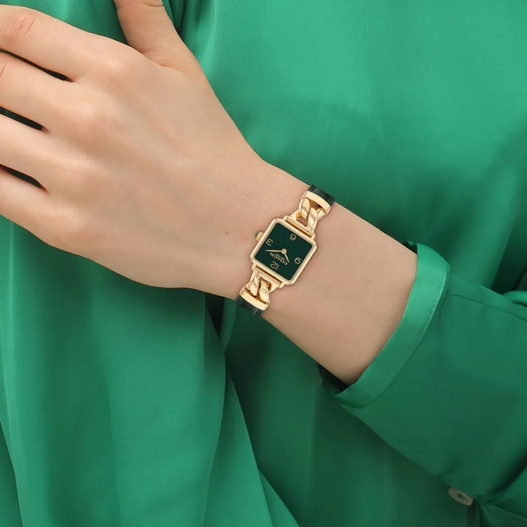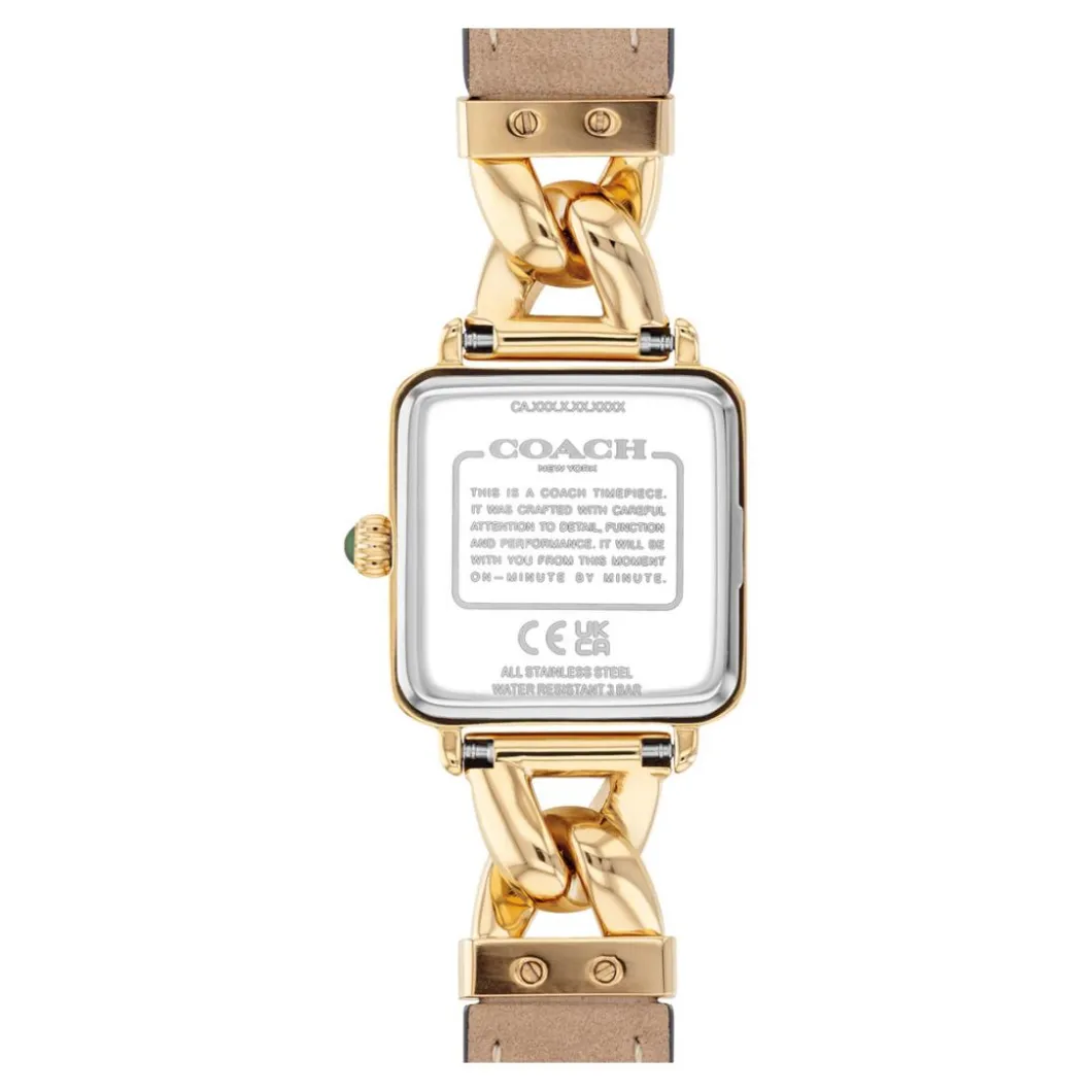 Cette élégante montre de femme signée Coach, modèle Cass 14504557, se distingue par son bracelet original conçu en cuir de couleur doré. L’affichage est analogique avec un mouvement à quartz. Quant à la couleur du boitier et du bracelet, elles sont dorées. Le boitier de forme carré, d’un diamètre de 22mm, est réalisé en acier, assurant sa solidité. Elle a un type de fermeture à boucle simple, pratique et sûre. Le verre minéral de l’écran protège de l’usure du quotidien. Cette montre est étanche jusqu’à 30 mètres, soit 3ATM. A noter, elle arbore des détails raffinés visibles sur l’image fournie.