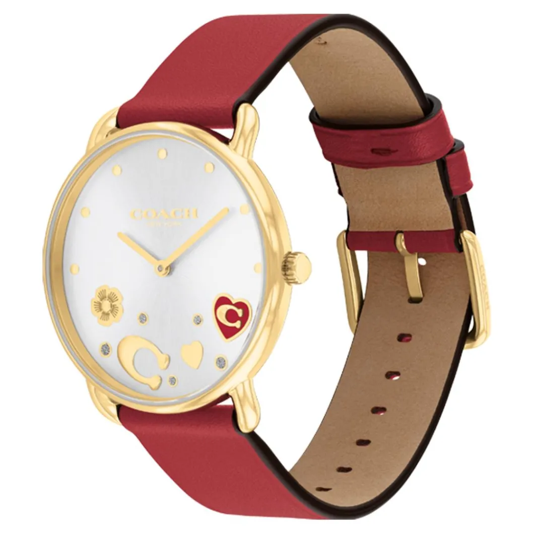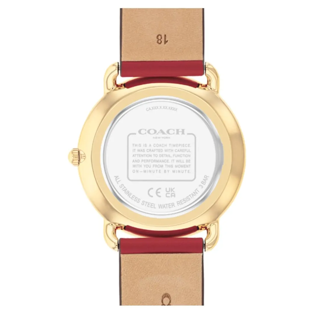 Découvrez la somptueuse Montre Femme Coach Elliot – 14504520, résolument féminine de par son boitier rond doré de 36 mm, réalisé en acier robuste. Son affichage analogique est mis en valeur par un verre minéral de haute qualité. Ce qui distingue cette montre, c’est son élégant bracelet en cuir rouge qui se ferme facilement via une boucle simple. Animée par un mouvement quartz, elle a une étanchéité de 3 ATM, ce qui la rend résistante à l’humidité quotidienne. Cette montre Coach est le parfait alliage entre fonctionnalité et design sophistiqué.