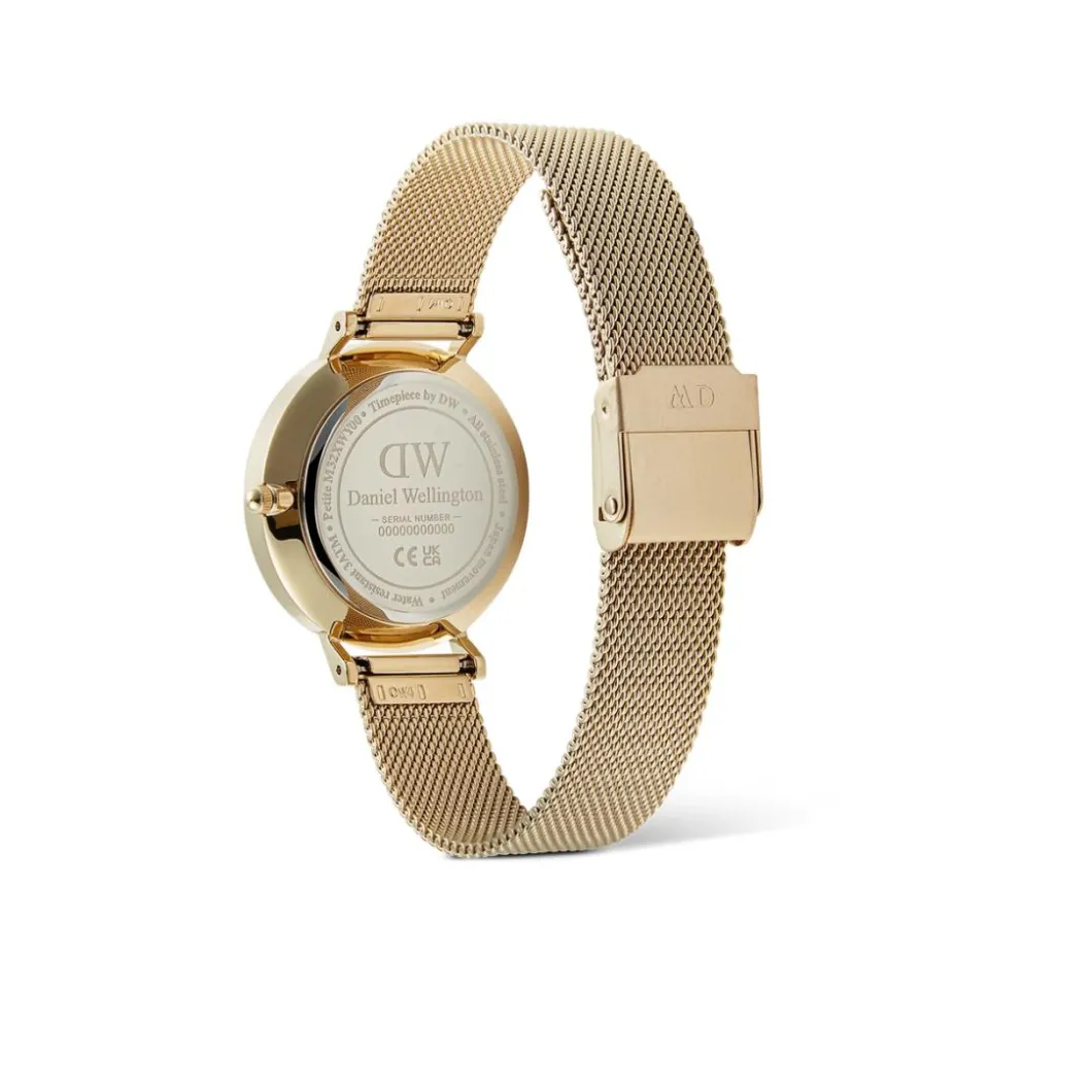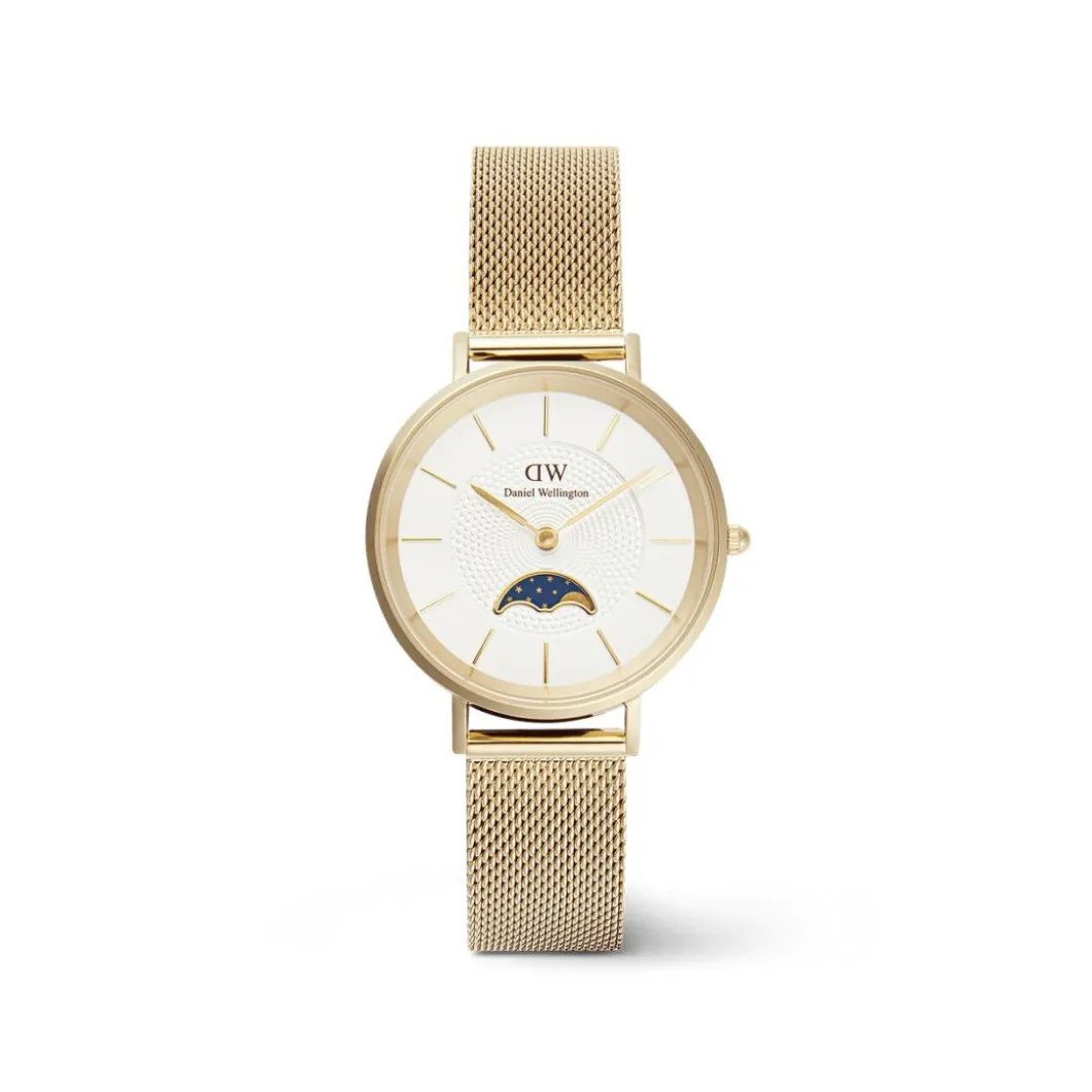 Cette Montre Femme Daniel Wellington Petite Moonphase-DW00100771 se distingue par son élégance intemporelle. Le boîtier doré de 32mm, associé à un bracelet de même couleur, en font un modèle sophistiqué, tout en raffinement. Le cadran noir affiche une délicate représentation de la phase lunaire et des index bâtons fins. Cette montre, alimentée par un mouvement quartz, garantit un affichage analogique précis. L’utilisation de l’acier pour le boîtier et le bracelet témoigne d’une excellente durabilité. Le verre minéral offre un bonne résistance aux rayures. Avec sa boucle déployante, cette montre dorée offre une sécurité accrue lors du port. Sa subtile combinaison de sophistication et de simplicité en fait une montre de choix pour les femmes modernes.