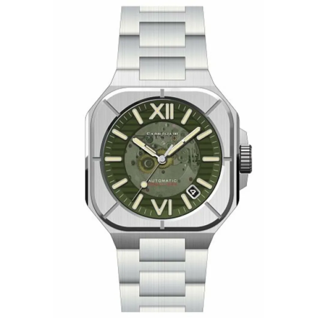 Cette Montre Homme ES-8258-44 – EARNSHAW Armoury Skeleton propose un boîtier carré abritant un cadran analogique équipé d’un dateur. Elle promet une étanchéité de 5 ATM.