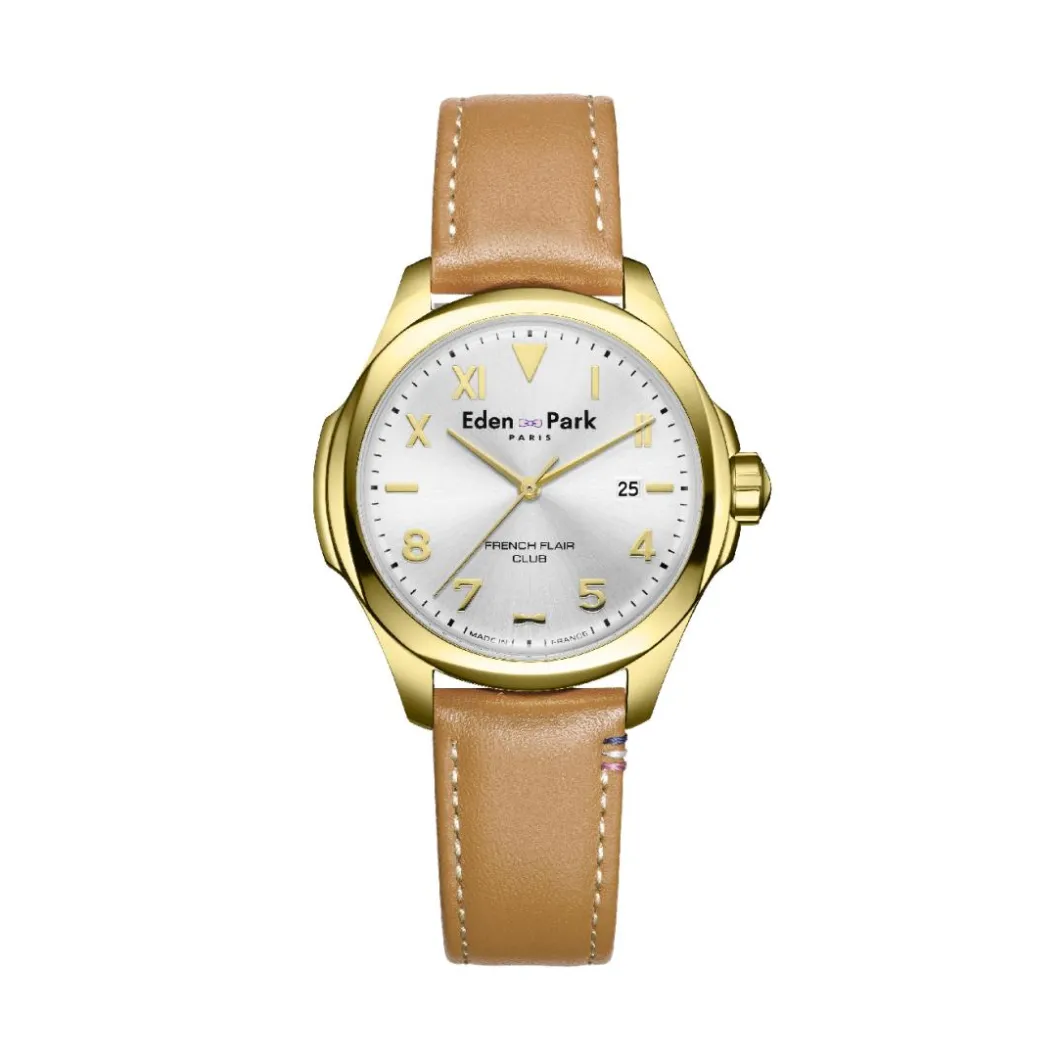 La Montre Homme Eden Park Club – EP19201P12MI avec son bracelet cuir beige symbolise l’élégance moderne. Son boîtier en acier doré de 38mm de diamètre renferme un affichage analogique agrémenté d’un dateur. Avec son mouvement quartz, cette montre est étanche jusqu’à 30 mètres. Elle se clôt par une boucle simple et est protégée par un verre minéral. Ce produit de la marque EDEN PARK s’adresse aux hommes.
