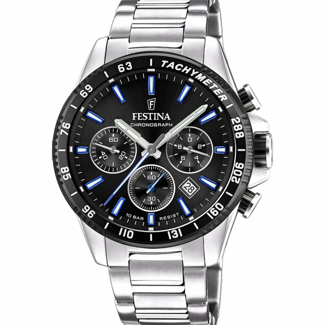 Robuste et imposante, cette Montre Festina F20560-5 Homme est un garde-temps à adopter absolument ! Le cadran rond de couleur noir est sublimé par un effet soleillé qui orne le fond afin de lui apporter un éclat supplémentaire. Au centre de ce cadran sont présents 3 compteurs afin de vous offrir la fonction chronographe. Les index bâtons se colorent de la lumineuse teinte bleue. Le bracelet en acier est composé de trois unités de maillons larges afin de renforcer l’aspect solide et sportif du modèle.