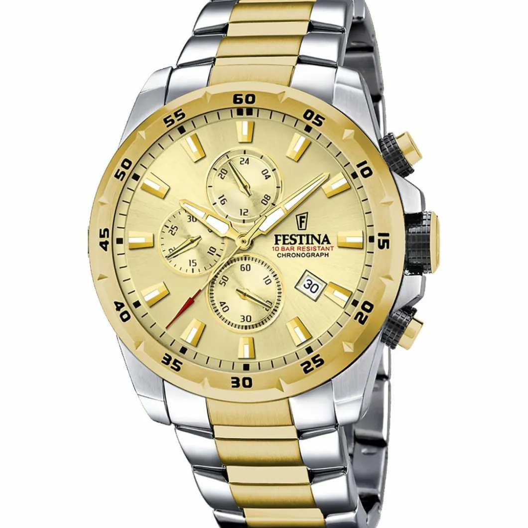 Pour répondre aux attentes des plus sportifs d’entre nous, Festina a choisi de décliner la Montre F20562-1 Homme dans une version chrono. Mis en valeur par l’imposant lunette graduée qui l’encercle, son cadran est habillé d’un lumineux doré et orné de trois totalisateurs. Indiquant l’heure avec clarté, c’est l’un des atouts majeurs de cette montre. Son bracelet bicolore, dont les finitions au niveau des maillons sont alternées. L’ensemble de ce modèle est en acier inoxydable.