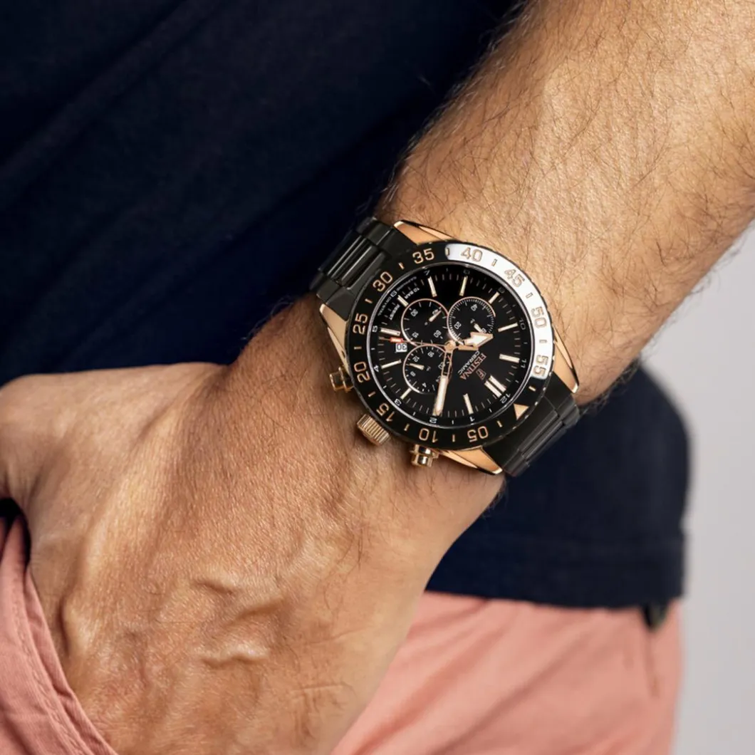 La marque Festina vous dévoile un modèle très sportif en acier avec un cadran rond : la Montre F20578-1 Homme. Son boitier d’un diamètre de 44 mm possède une couleur or rose. Les marqueurs temporels sont luminescents : ils s’éclairent dans l’obscurité grâce à la réflexion de la lumière du jour ! Les boutons poussoir sont reliés aux 3 compteurs nichés dans le cadran. Le bracelet est constitué d’acier, matériau robuste et résistant.