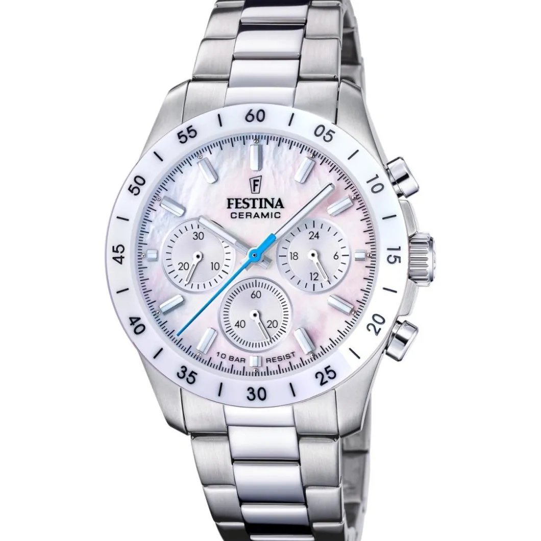 Cette élégante montre de marque Festina est spécialement conçue pour les femmes qui apprécient la qualité et le style. Avec son boitier rond de couleur argent et son bracelet également en argent, cette montre-bracelet Festina Ceramic – F20693-1 dégage une aura de sophistication et de raffinement. Le grand cadran de 39mm facilite la lecture des heures, tandis que la fonction chronographe ajoute une fonctionnalité pratique. Son mouvement quartz garantit une précision de temps irréprochable. Le verre minéral protège le cadran et le mouvement d’éventuels impacts. Enfin, grâce à son étanchéité de 100m, vous pourrez l’emmener sans risque au bord de la piscine ou en plongée avec vous. Avec son bracelet en acier et sa fermeture par boucle déployante, cette montre allie confort et durabilité.