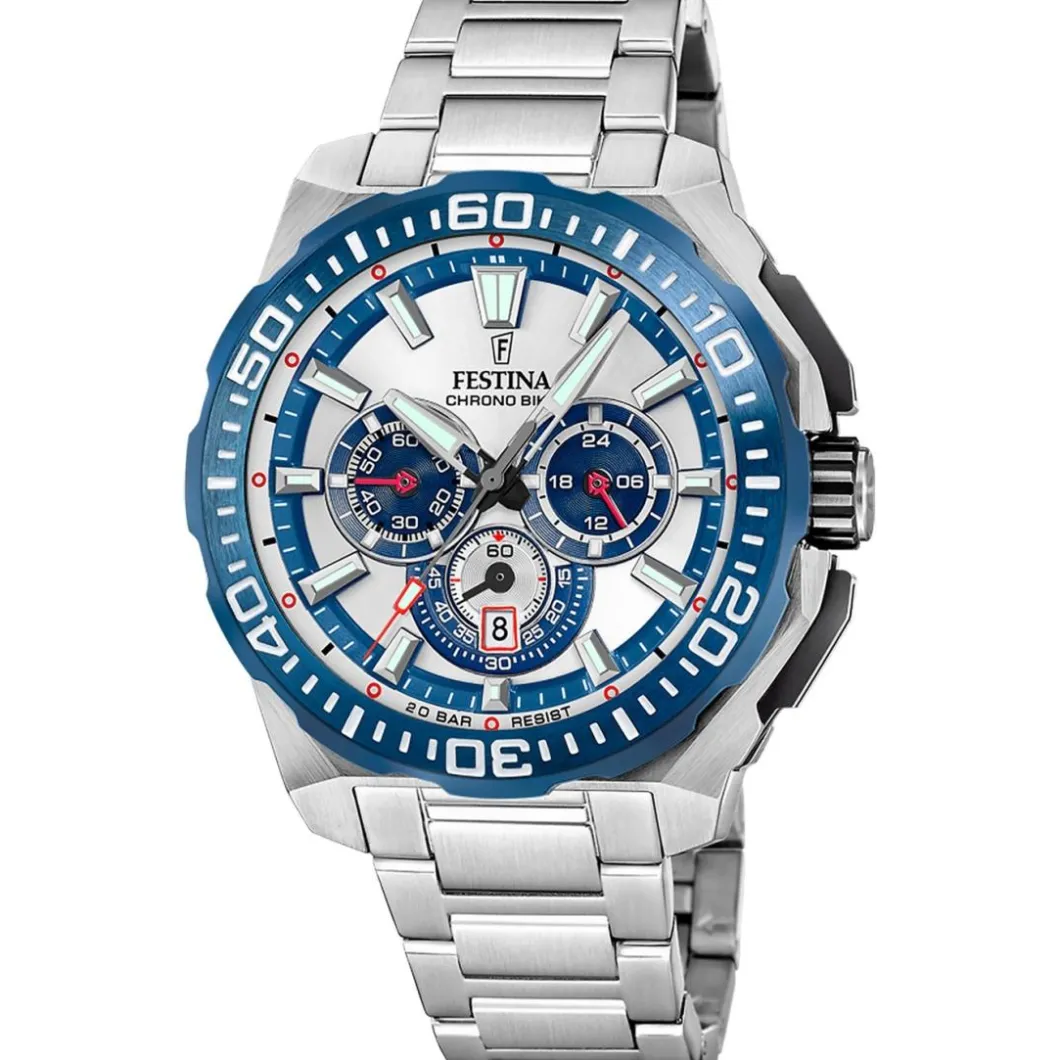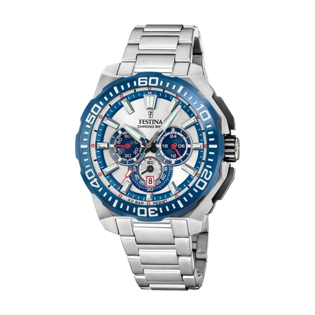 La Montre Homme Festina Chrono Bike – F20724-1 avec un bracelet en acier argente est un bijou de précision mécanique de la catégorie Montre Homme. Cette pièce futuriste dispose d’un affichage analogique clair et précis. Le boîtier rond, d’un diamètre de 46 mm, renferme un mouvement à quartz et est encapsulé dans un verre minéral robuste. Son étanchéité, allant jusqu’à 200 m (20 ATM), lui permet de résister aux activités aquatiques intensives. Le bracelet et le boîtier sont tous deux en acier, offrant élégance et résistance. En termes de fonction, cette montre est équipée d’un chronographe. La fermeture est assurée par une boucle déployante, pour un enfilage et un retrait harmonieux. Si vous observez attentivement, vous découvrirez des détails ingénieux qui accentuent la beauté de cette pièce de Festina.