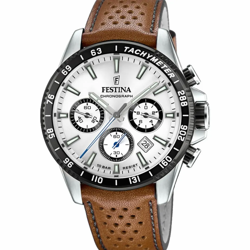 Découvrez cette Montre Homme Festina TIMELESS CHRONO F20561-2 – Bracelet Cuir Bleu, une montre fonctionnelle au look sportif. Une lunette fixe de couleur noire avec des marqueurs temporels en chiffres se pose sur le boitier. Le fond du cadran adopte une couleur blanche avec une jolie finition soleillée apportant du relief et de la luminosité. La particularité de ce modèle réside dans ses compteurs présents à trois, six et neuf heures. C’est un bracelet sportif et tendance en cuir qui vient compléter le look de ce chronographe.