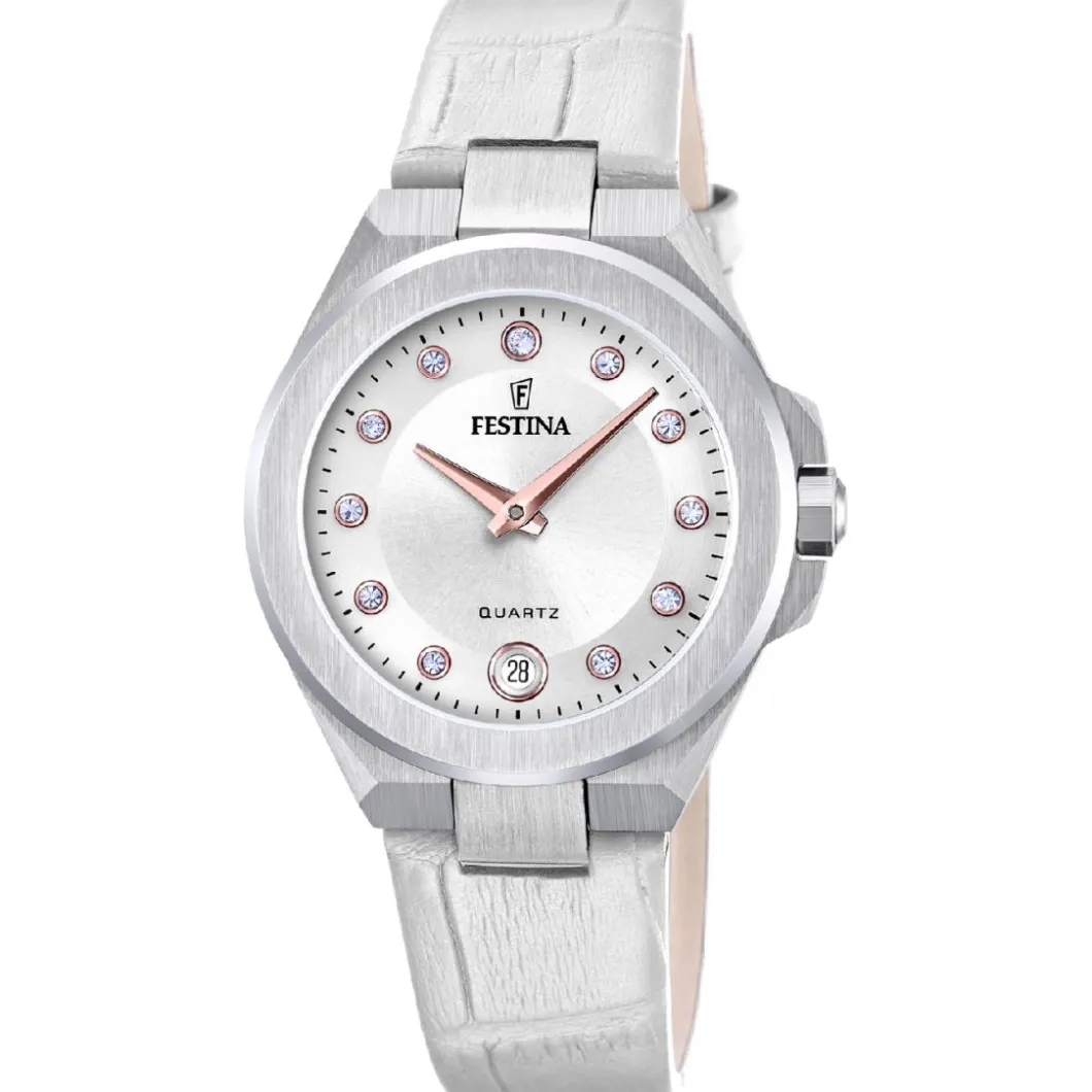 La Mademoiselle F20701-1 est une montre pour femme de la marque Festina. Le boîtier rond de cette montre, en acier, a un diamètre de 33 mm. Son bracelet blanc est conçu en cuir véritable, doté d’une boucle simple pour une fermeture sécurisée. Avec un affichage analogique, cette montre a un mouvement à quartz, garantissant une précision temporelle optimale. Elle est équipée d’une fonction dateur pour un usage quotidien pratique. Son verre minéral renforce sa solidité. La couleur du boîtier est acier, qui s’harmonise parfaitement avec le blanc du bracelet. Cette montre résiste à l’eau jusqu’à une profondeur de 50 mètres.