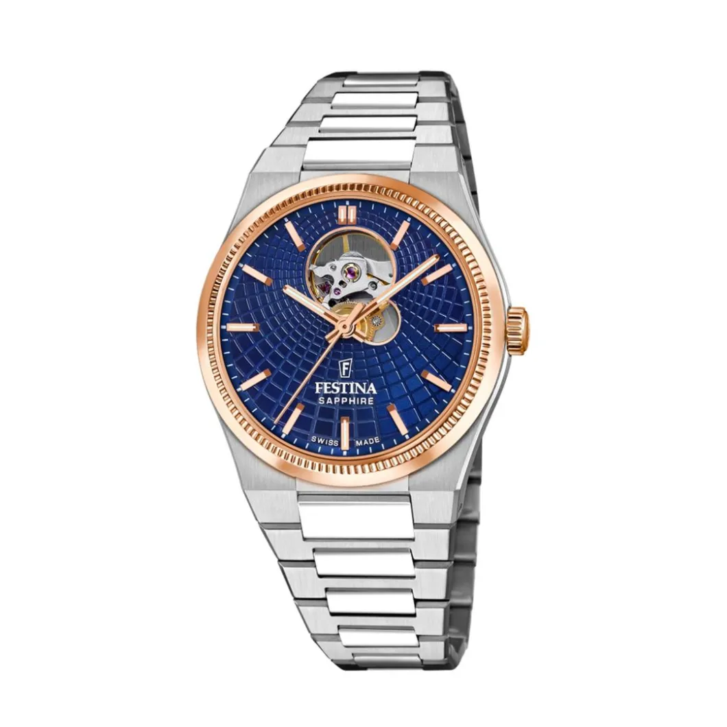 Cette montre homme de la marque Festina Swiss Made est un modèle Swiss Made Automatico – F20061-2. Elle est dotée d’un affichage analogique et sa taille de boîtier est de 40 mm. La montre se démarque par un boîtier bicolore, ce qui lui confère une élégance certaine. Le bracelet en acier de couleur argent est assorti au boîtier, assurant une harmonie parfaite. Le mouvement automatique offre une précision fiable, et la montre est étanche jusqu’à 100 mètres. Autre fonctionnalité pertinente : un dateur. Le verre en saphir résistant aux rayures, renforce sa durabilité. Enfin, elle est munie d’une boucle déployante pratique pour un port plus sûr.