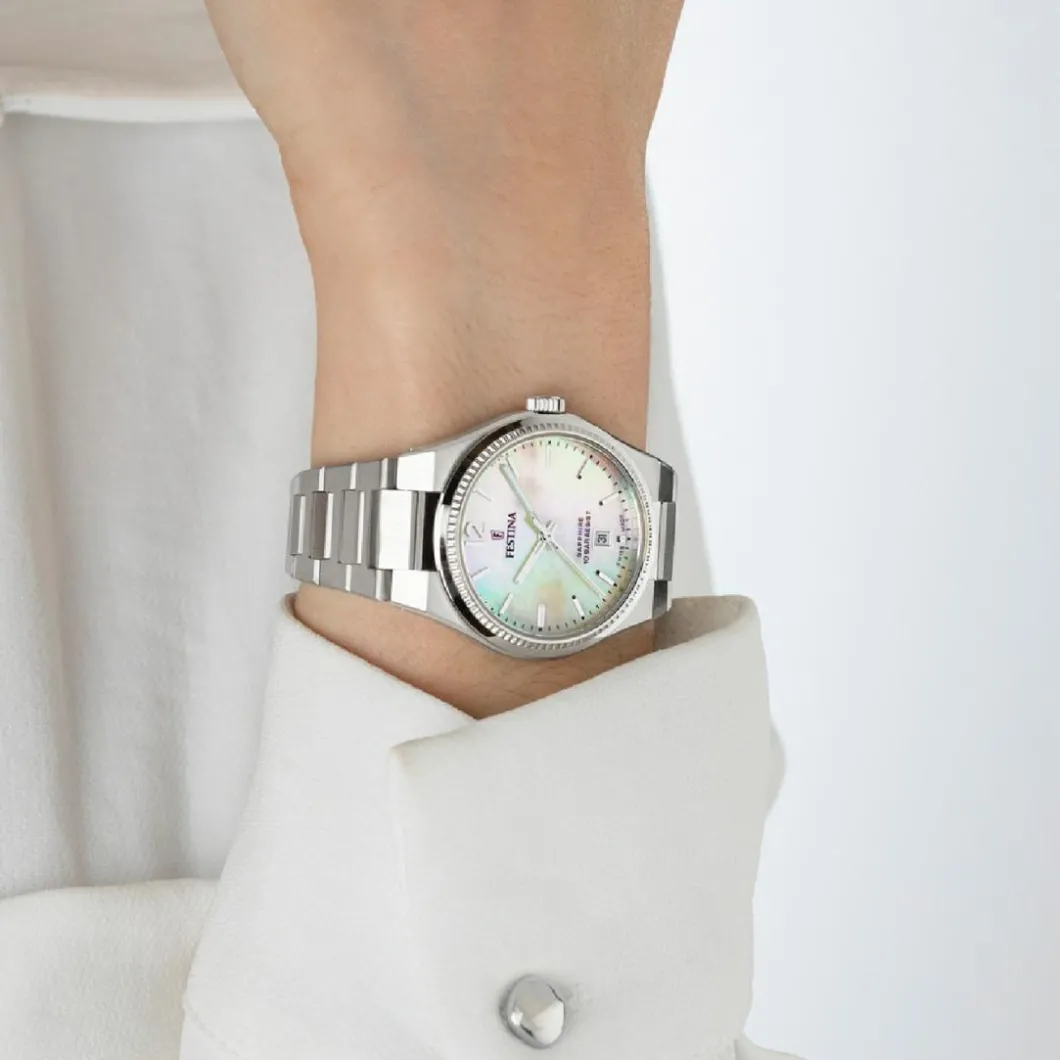 La Montre femme Festina Swiss Made Rive Collection – F20052-1, se présente avec un bracelet acier de couleur argent. L’élégance incontestable de cette montre Festina se démarque par son boitier rond de 35mm en acier de la même couleur que le bracelet. Avec son système de fermeture à boucle déployante, le port de cette montre est un véritable confort, tout en garantissant un maintien optimal. Elle est dotée d’une fonctionnalité dateur et d’un mouvement quartz. Sa résistance à l’eau garantit une étanchéité jusqu’à 100m (10 ATM). L’horloge affiche les heures en analogique derrière un verre en saphir, reconnu pour sa robustesse. Cette montre est idéale pour toutes celles qui apprécient le raffinement et l’élégance intemporelle.