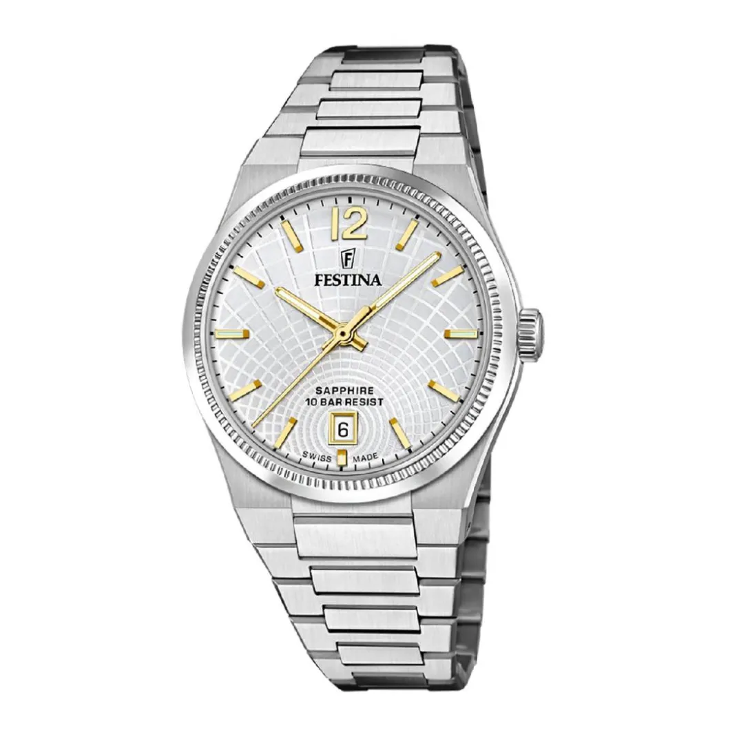 Découvrez cette sublime montre Festina pour femme, de la collection Rive. Elle se distingue par son bracelet argenté et son boîtier rond en acier de couleur argent, d’un diamètre de 35mm. Le bracelet est en acier, et se ferme via une boucle déployante. La montre est de type quartz et affiche l’heure de manière analogique. Elle intègre une fonctionnalité dateur qui ajout une touche pratique à l’élégance du design. La montre est étanche à 100m, ce qui en fait un choix parfait pour les amatrices de baignade et de plongée. Le verre saphir ajoute une touche de brillance et de résistance à ce magnifique accessoire.