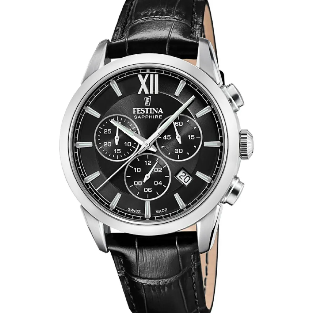 La Festina Swiss Made Chrono – F20041-4 est une montre homme élégante et raffinée qui allie classe et performance. Son boîtier argenté, rond, d’un diamètre de 41 mm, est fabriqué en acier robuste. Son bracelet noir est en cuir véritable, apportant une touche chic à l’ensemble. L’affichage analogique est clair et précis, rendu possible grâce à un mouvement quartz de qualité. De plus, elle est équipée d’un chronographe, d’un dateur et présente une étanchéité de 100 mètres (10 ATM), ce qui la rend idéale pour des utilisations variées. Son verre est en saphir, gage de durabilité et de résistance. Enfin, sa fermeture se fait via une boucle simple, pratique et facile à utiliser. En somme, la montre Festina alliant le noir et l’argent est un bijou intemporel, alliant esthétique et fonctionnalité.