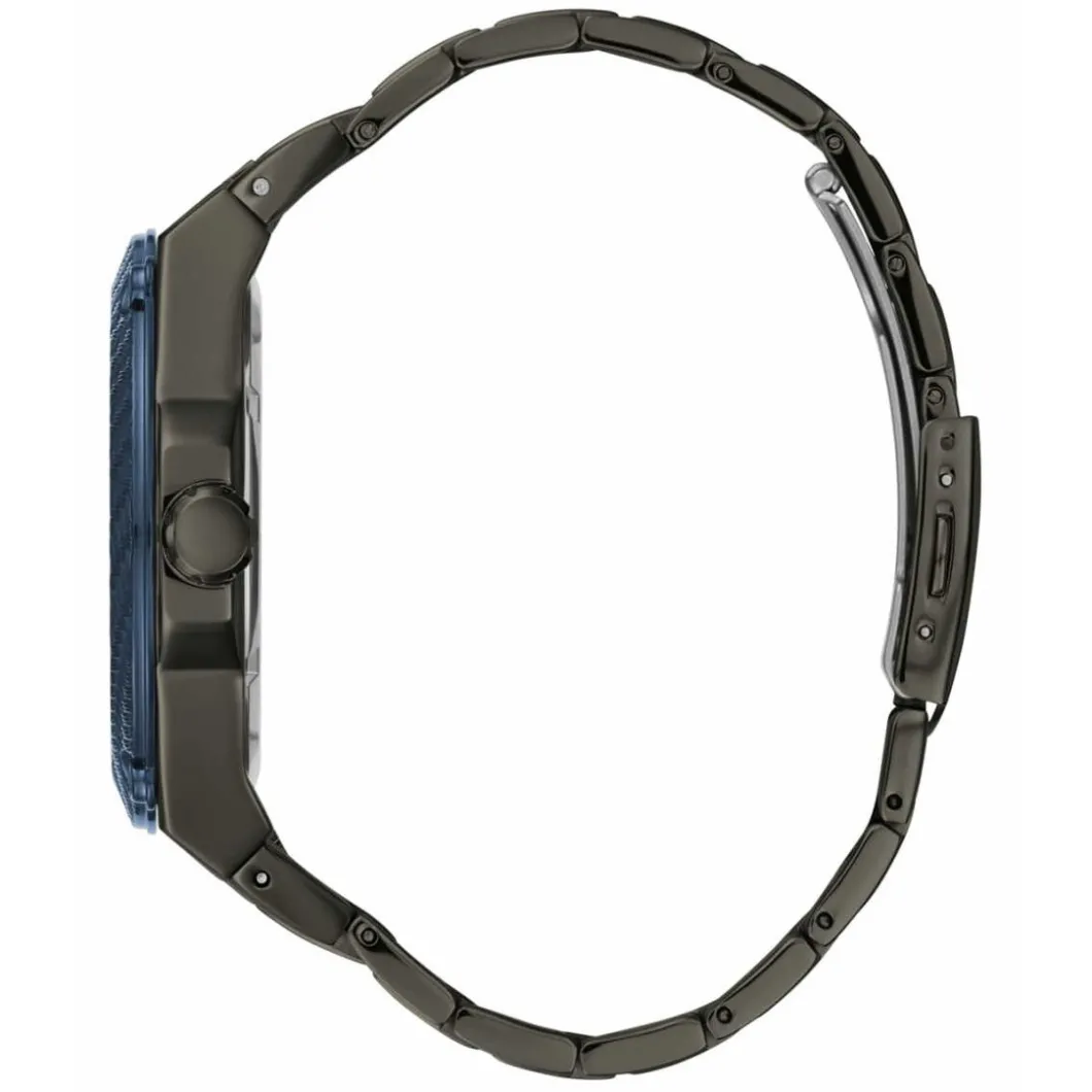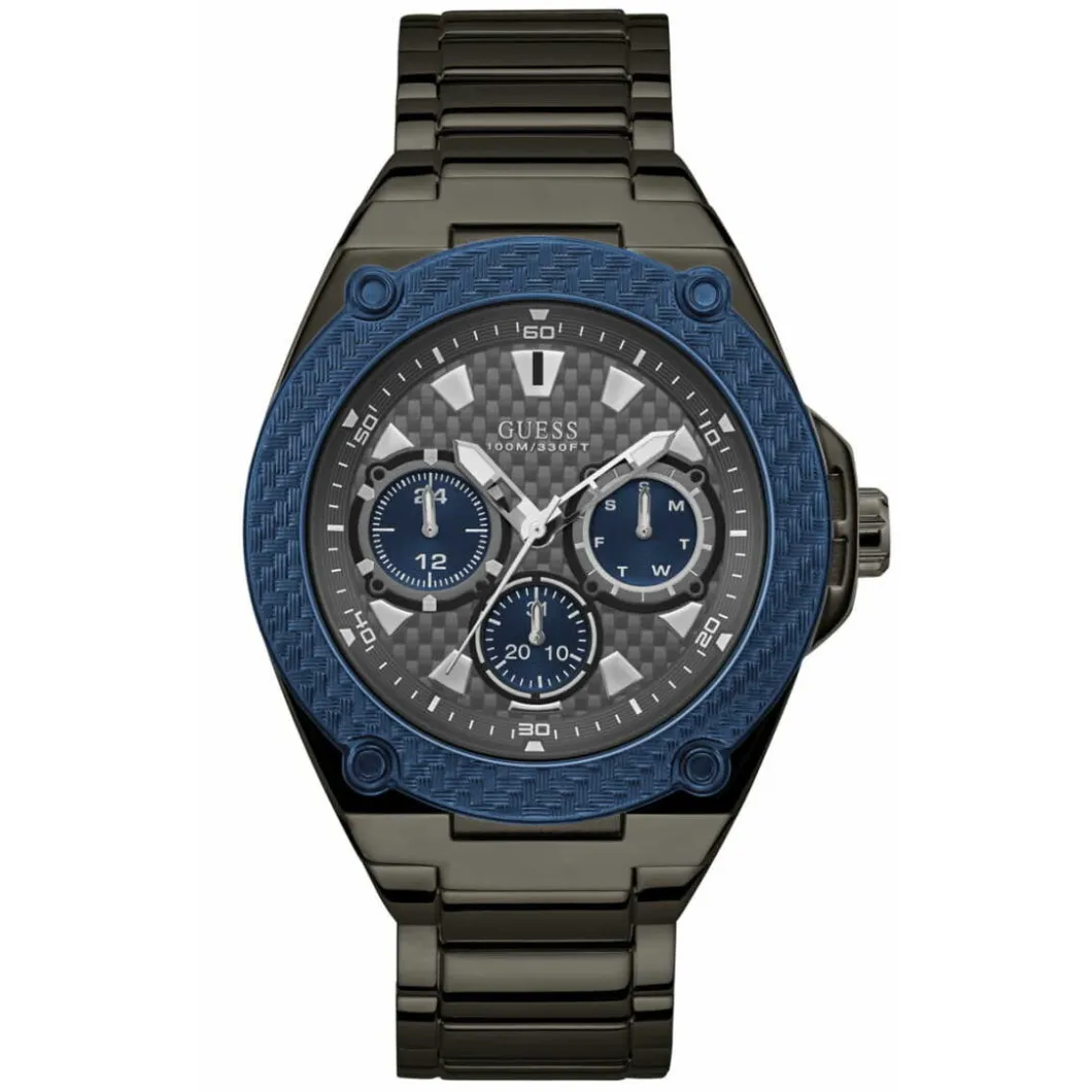 Vous aimez les montres sportives ? Choisissez le modèle W1305G3 de la Ligne LEGACY de GUESS pour les looks ou moments de sport. Multifonctionnelle, cette montre affiche à la fois l’heure, la date, un chrono. Le tout exposé sur un cadran gunmetal de 45 mm. A cela s’ajoute un design très viril avec le boîtier rond et bracelet, tous les deux faits d’acier de canon de fusil. Ce modèle comprend également une lunette IP Bleue
