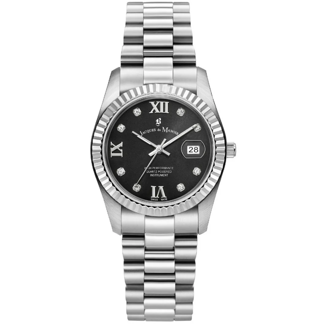 Cette Montre Femme Jacques Du Manoir est un assemblage d’élégance et de simplicité. Elle se distingue par sa couleur argent, métallique et raffinée qui brille sous tous les angles. Le boîtier de la montre, d’un diamètre de 34 mm, est parfaitement proportionné pour une lecture aisée du temps. La marque Jacques Du Manoir fait preuve d’expertise horlogère en offrant ce bijou d’une beauté sublime.