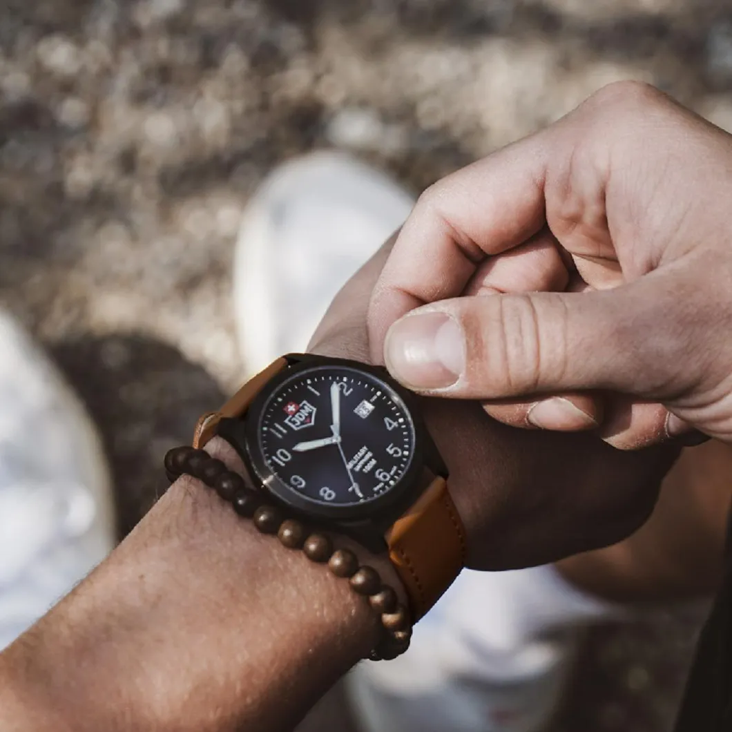 La Montre Homme JDM Military Alpha I – JDM-WG001-02 offre une touche masculine et élégante. Son boîtier rond en acier argenté de 40 mm de diamètre abrite un mouvement quartz et un affichage analogique avec dateur. Le bracelet marron est en cuir, avec une boucle simple pour fermeture. Son verre en saphir et son étanchéité jusqu’à 100 m caractérisent sa robustesse. Comme toutes les pièces signées JDM Military, elle allie qualité et style, ce qui en fait un excellent accessoire pour les hommes.