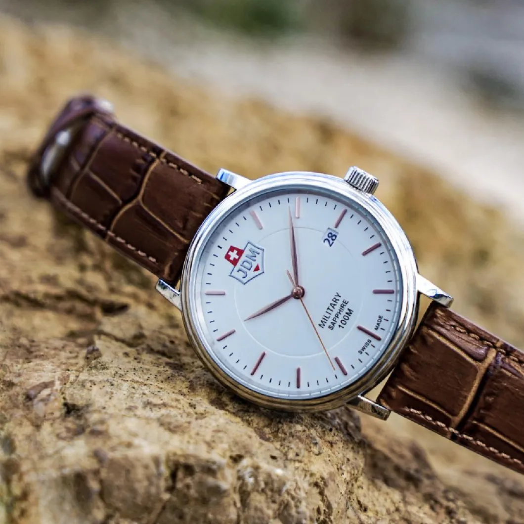 Découvrez la Montre Homme JDM Military Kilo – JDM-WG004-05 de la marque JDM Military. Avec son affichage analogique, elle porte un boîtier argenté rond en acier, d’un diamètre de 40 mm et verre en saphir. Le bracelet est marron, réalisé en cuir de qualité, avec une fermeture à boucle simple pour un style masculin. Dotée d’un mouvement à quartz, elle a une étanchéité allant jusqu’à 100 m et une fonctionnalité dateur intégrée.