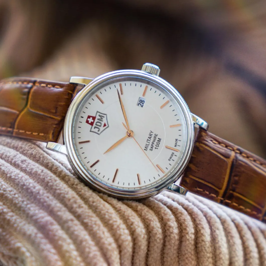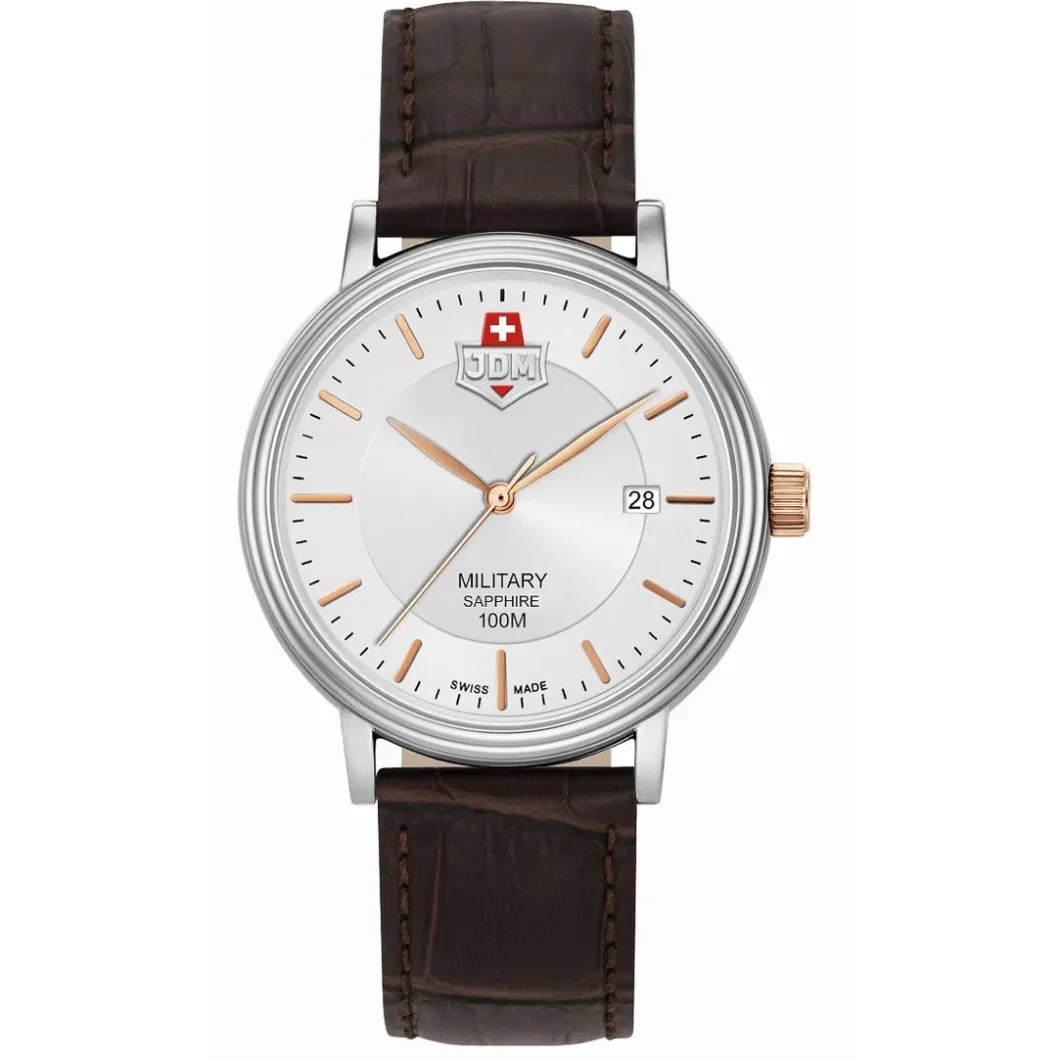 La Montre Homme JDM Military Kilo – JDM-WG004-06 Bracelet Cuir Marron est un bijou d’une robustesse incontestable. De couleur marron, le bracelet est en cuir tandis que son boîtier rond a un diamètre de 40 mm et est fait d’acier de couleur argent. Elle offre une étanchéité jusqu’à 100m et inclut une fonction dateur. Le mouvement quartz assure une précision sans faille. Sa boucle simple facilite son usage quotidien. Son verre saphir offre une protection optimale. Elle est purement analogique, reflétant une élégance intemporelle.