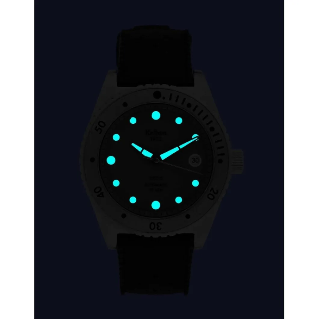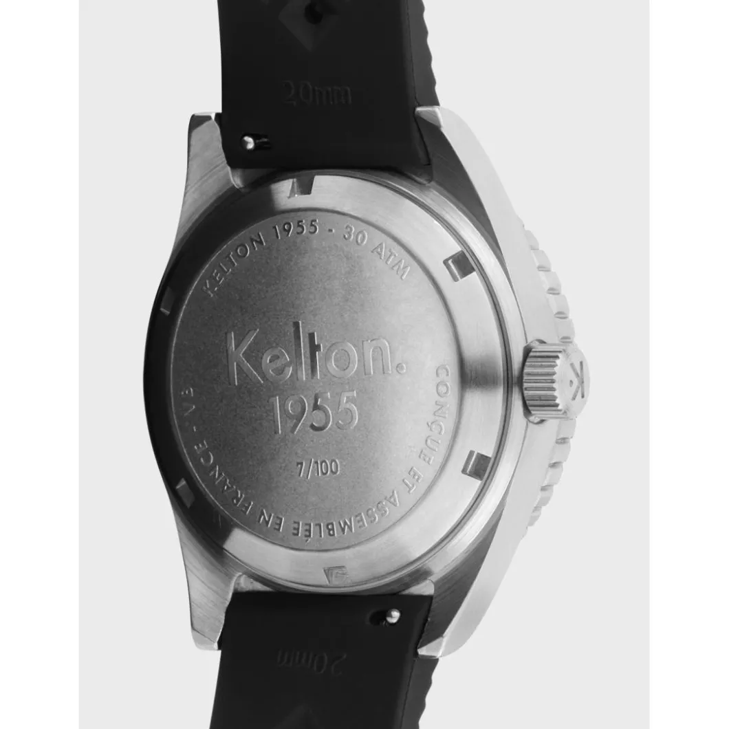 La montre 1955 Tropic – 30 ATM est équipée d’un bracelet « Tropic » en caoutchouc naturel vulcanisé, classique ressurgi des sixties, comme Kelton. Le bracelet Tropic a toujours été le fidèle compagnon des plongeurs et autres amateurs de sports nautiques, grâce à deux qualités majeures : souplesse et résistance. La 1955 – 30 ATM marque le début de notre mission de mécénat auprès de la Fondation de la mer, en effet Kelton reversera 10 % des bénéfices de la vente de ce modèle afin de contribuer à son action d’étude et de protection de l’Océan. Que vous plongiez dans le travail ou au large de La Digue, l’immédiate lisibilité du cadran est parfois cruciale, nous avons donc surdimensionné les index placés à 6 – 9 et 12 h, afin de les rendre plus visibles. Plus que jamais, une véritable montre de plongée techniquement irréprochable et capable d’affronter les conditions les plus extrêmes, 300 mètres (environ), tout en gardant son design original ; c’est une Kelton et pas autre chose ! Toutes les montres Kelton sont conçues et assemblées en France.