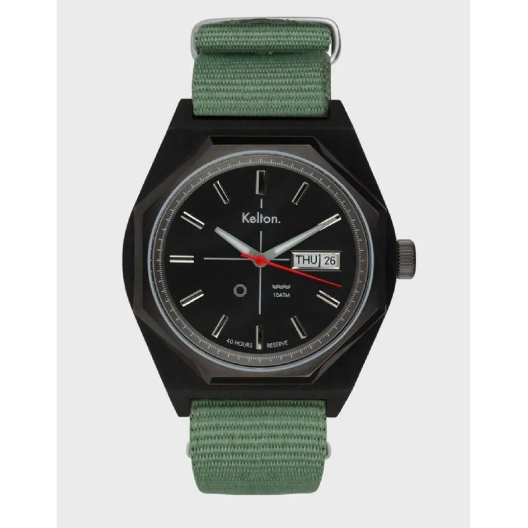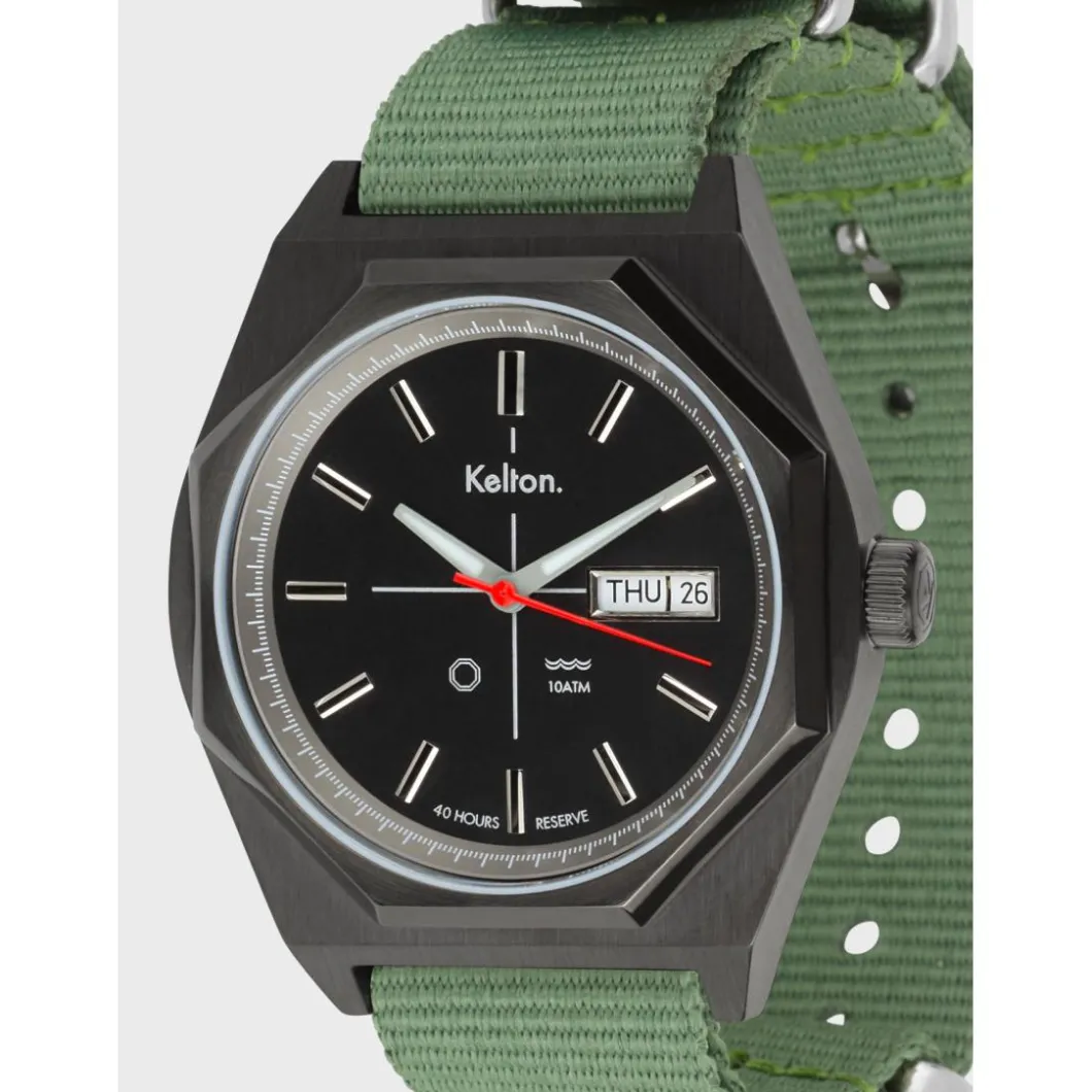 La montre Octogone Titane Nato Kaki au style rétro-futuriste vous souhaite la bienvenue en 2049. Sa version Titane s’adresse aux plus « bad boys » d’entre nous. Ici, nous avons optimisé les potentiels immenses de ce modèle Kelton de la fin des années 70. Tout d’abord en re-dessinant son boitier, équipé à présent d’un mouvement automatique jour/date Seagull 1632. Ses aiguilles (heures et minutes) traitées au Superluminova sont devenues luminescentes, enfin, nous avons utilisé un verre saphir et cette petite bombe automatique résiste maintenant à une pression de 10 ATM. L’Octogone est, depuis que la question du futur hante le cinéma, la forme que prend à peu près tout objet à venir. Cela va des portes (dans les couloirs des vaisseaux) aux vaisseaux eux-mêmes en passant par l’architecture, les robots… D’où cette vague de modèles octogonaux apparue à la fin des décennies Space Age (70’s), chez un grand nombre d’horlogers y compris Kelton, il y en a des centaines. Toutes les montres Kelton sont conçues et assemblées en France.