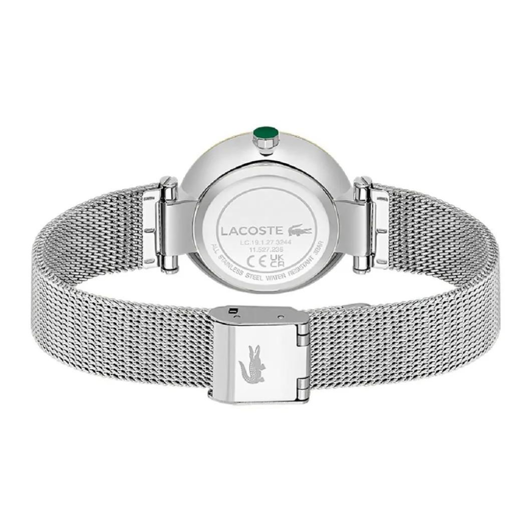 Cette sublime montre femme arbore fièrement la marque Lacoste. Elle se distingue par son alliage de couleurs raffinées – son boîtier de couleur doré qui rehausse son charme et son élégance. Son diamètre de boîtier de 30 mm et sa largeur de bracelet de 16 mm la rendent discrète et distinguée. C’est un bijou qui allie sobriété et tendance.