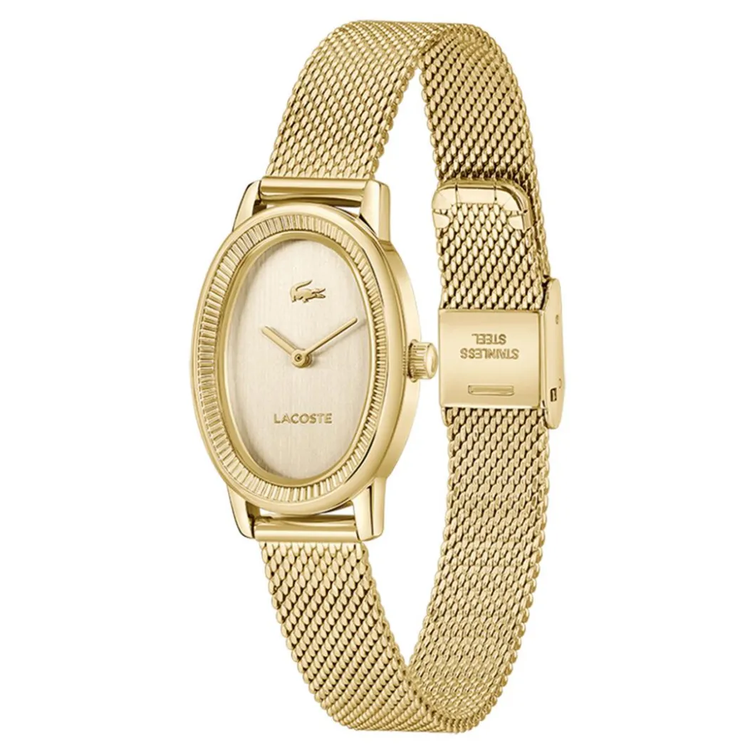 Lacoste propose cette magnifique montre féminine issue de la collection parisienne. Le doré lui donne un aspect luxueux et branché. Son boîtier ovale, également de couleur doré, est conçu en acier pour une grande solidité. Le bracelet, du même coloris et matière, épouse parfaitement la forme du poignet pour un confort optimal. Avec un diamètre de 22 mm, le cadran est clairement visible sans être trop envahissant. Le mouvement quartz assure une précision irréprochable. L’étanchéité de la montre, jusqu’à 30 mètres, garantit sa fiabilité en toutes circonstances. La montre ferme avec une boucle déployante pour une utilisation facilitée. Le verre minéral offre une excellente résistance aux rayures.