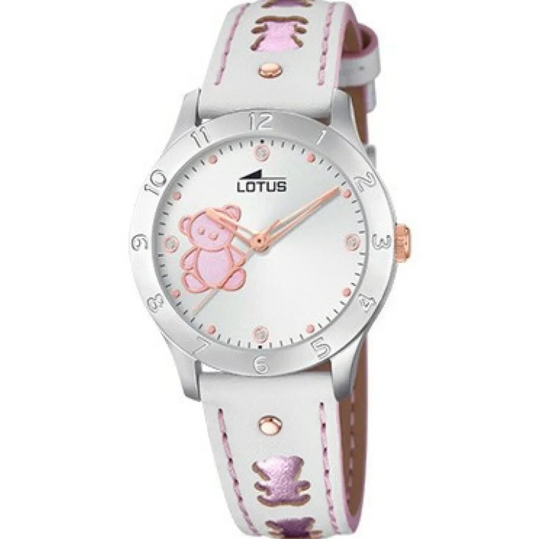 Voici la nouvelle montre pour fille Lotus JUNIOR 18657-B. Son bracelet en cuir blanc est orné de plusieurs oursons, et cet esprit féerique est maintenu au niveau du cadran lui aussi habillé par un ourson mignon qui accompagnera vos petite fille dans ses multiples aventures quotidiennes.
