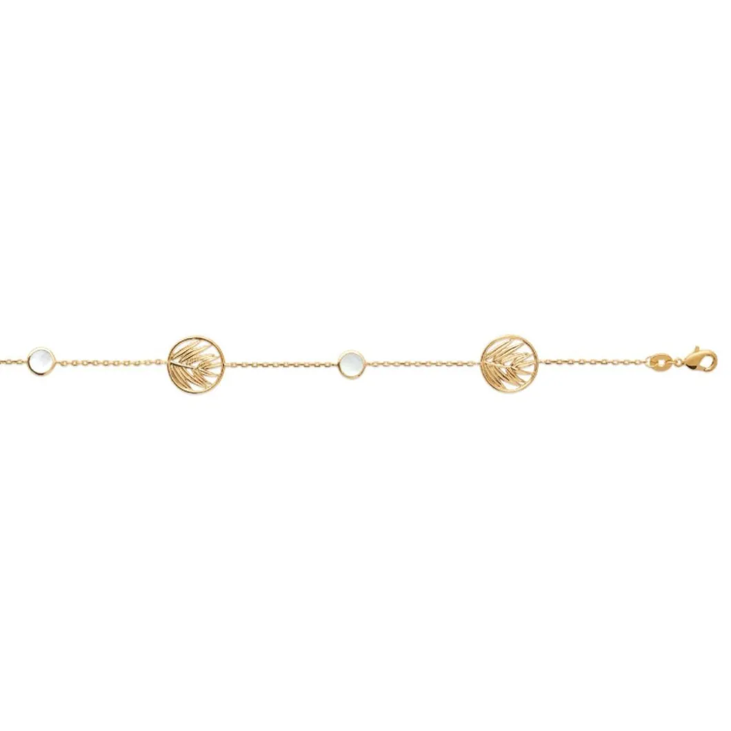 Ce Bracelet Femme UW3Y04ZV Maison de la Bijouterie subjugue par sa palette de couleur dorée et colorée. Il sublime le poignet avec des pastilles de pierres de lune naturelle et des feuilles dorées encerclées.