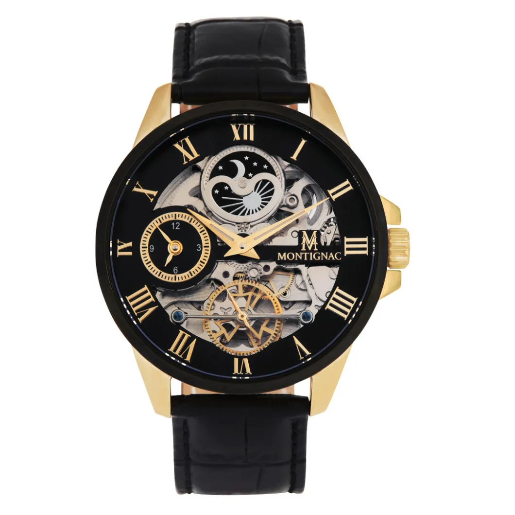 Montre Montignac MOW148 Homme – Pour ceux qui sont à la recherche d’une montre classe et élégante, voici la Montre Montignac MOW148. Elle dispose d’un boîtier en acier doré et d’un bracelet en cuir noir, sans oublier son cadran noir laissant apparaître l’intérieur de son mécanisme. Un accessoire très polyvalent et très apprécié par les hommes qui prêtent attention au look de leur poignet.