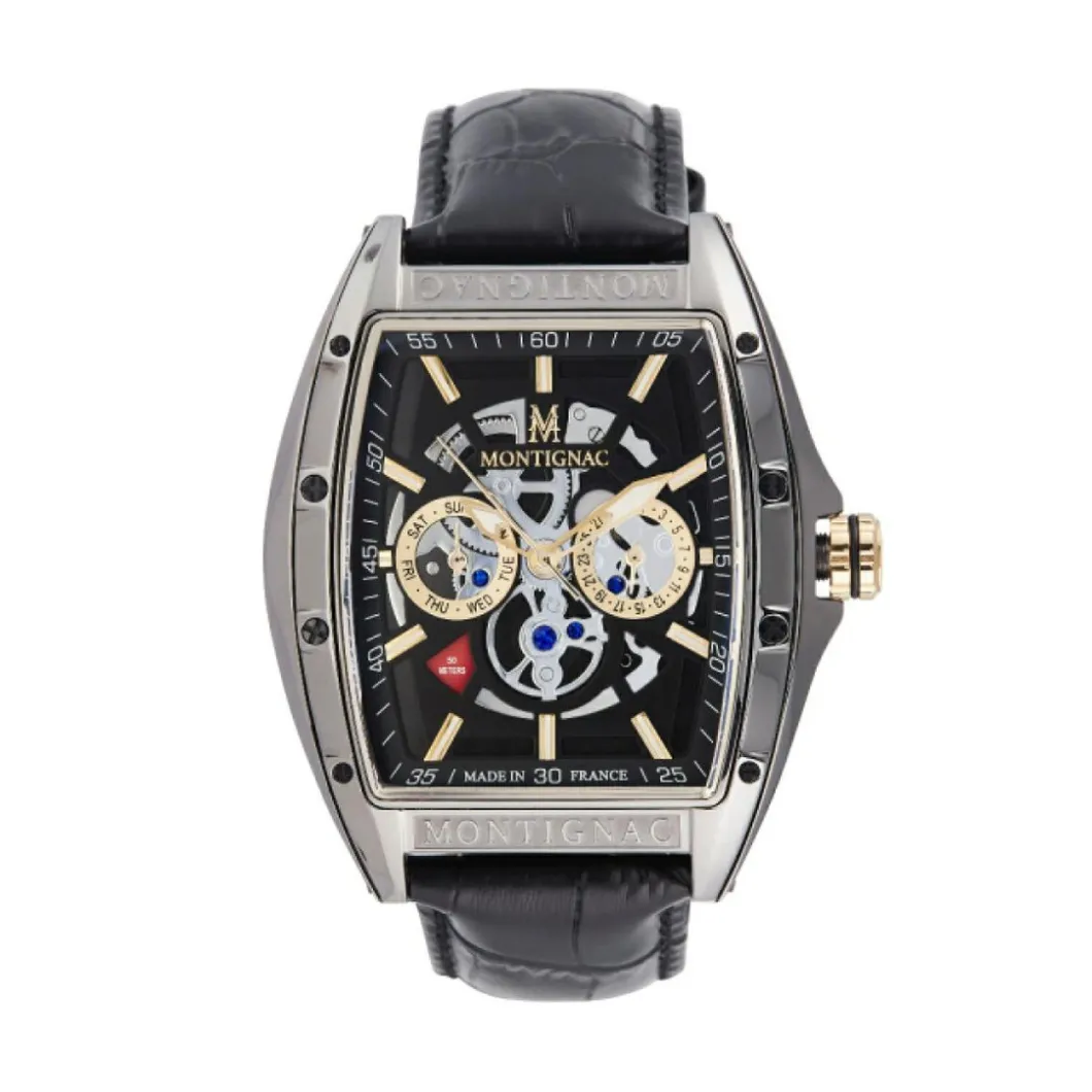 Autour de quatre formes puissantes qui puisent leur inspiration aussi bien dans les canons horlogers séculaires, que dans les marques d’avant-garde, Montignac offre une alchimie unique où l’automatique est maître. Un modèle automatique en 5 ou 10 ATM à couronne vissée à un prix aussi accessible est une opportunité pour le consommateur. La puissance du design s’exprime au travers d’une architecture moderne. Là, un cadran classique conjugue l’or rose au noir profond, créant une tension esthétique à nulle autre pareille. Ailleurs, le cadran s’efface pour dévoiler la technicité du mouvement automatique, dont chaque rouage peut être admiré dans ses moindres détails. Les tons de l’or rose se reflètent dans des dégradés de bleu, vert, noir ou gris. Au gré de compositions issues du bureau d’études de Montignac, chaque personnalité s’affirmera en fonction d’un style unique, où la quête de performance mécanique, s’alliant à un design puissant.