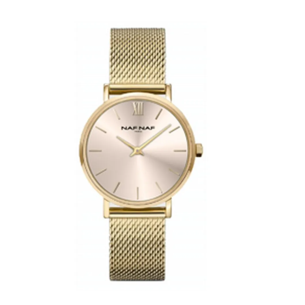 La montre femme Naf Naf – NAFW1056 arbore un design élégant avec un bracelet et un boîtier en acier couleur doré. Sa taille réduite, avec un diamètre de boîtier de 32 mm, et sa forme ronde conviennent parfaitement à un poignet féminin. Cette montre à affichage analogique est dotée d’un mouvement Quartz, garantissant une précision exemplaire de l’heure. Le bracelet de couleur dorée se ferme en toute simplicité grâce à une boucle simple. Par ailleurs, cette montre féminine possède un verre minéral qui résiste bien aux rayures et aux chocs légers. Un véritable bijou de technologie et d’esthétisme.