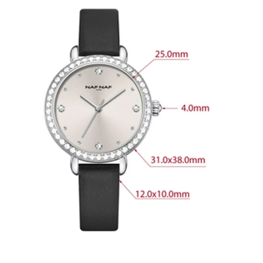 La Montre Femme Naf Naf – NAFW1161 est un ensemble en couleur Noir qui attire l’œil et séduit par son charme raffiné. Son bracelet en cuir noir s’harmonise parfaitement avec le boitier rond en acier de couleur argent. Le diamètre du boîtier est de 31mm, ce qui rend cette montre délicate et élégante. Le mouvement quartz offre une précision optimale. La montre est pourvue d’une fermeture boucle simple, assurant sécurité et simplicité d’utilisation. Pour finir, elle présente un verre minéral offrant résistance aux rayures et une vision claire de l’affichage analogique.