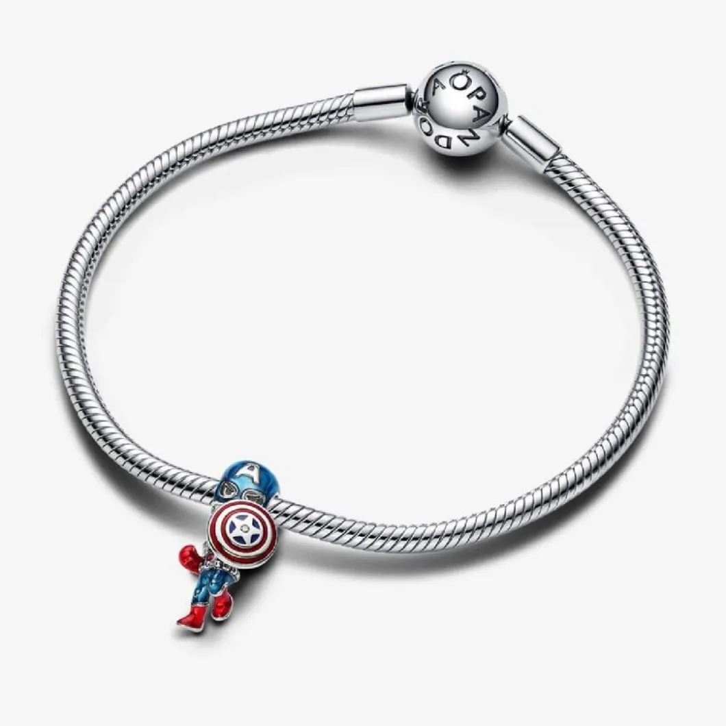 Ce charm exquis à l’effigie de Captain America est un produit de la marque Pandora. Il est réalisé en argent 925/1000 et agrémenté d’une émail rouge et bleue. Ce charm, qui s’adresse aux femmes, est également orné de zirconia clair et rouge pour une élégance optimisée. Sa couleur dominante Bleue rappelle fidèlement le personnage Marvel. Résolument féminin, il appartient à la catégorie « charms et perles ». Enfin, qu’il soit porté seul ou associé à d’autres charms, il saura attirer l’attention par son oxyde de zirconium éclatant.