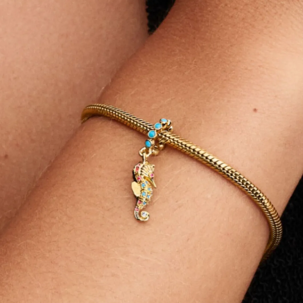 Découvrez l’éblouissement marin avec le Seahorse 14k gold-plated dangle with clear cubic zirconia, capri blue crystal and phlox pink crystal de la marque Pandora. Appartenant à la collection Pandora Moments, ce charm hérite de la couleur turquoise, une représentation sublime du monde sous-marin. Conçu spécifiquement pour les femmes, il est fabriqué à partir de Métal doré à l’or fin 585/1000. Les pierres semi-précieuses qui l’ornent ajoutent une nuance de luxe à cette création. Ce type de charm peut être ajouté à tout bracelet Pandora standard pour apporter une touche de sophistication.