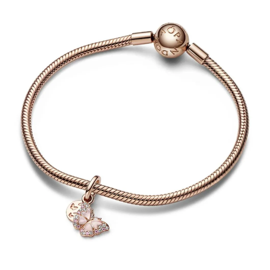 Retrouvez la magie des contes de fées à travers ce Charms Pendant double Papillon Rose et Citation – Pandora : une superbe création qui symbolise la liberté et la délicatesse.