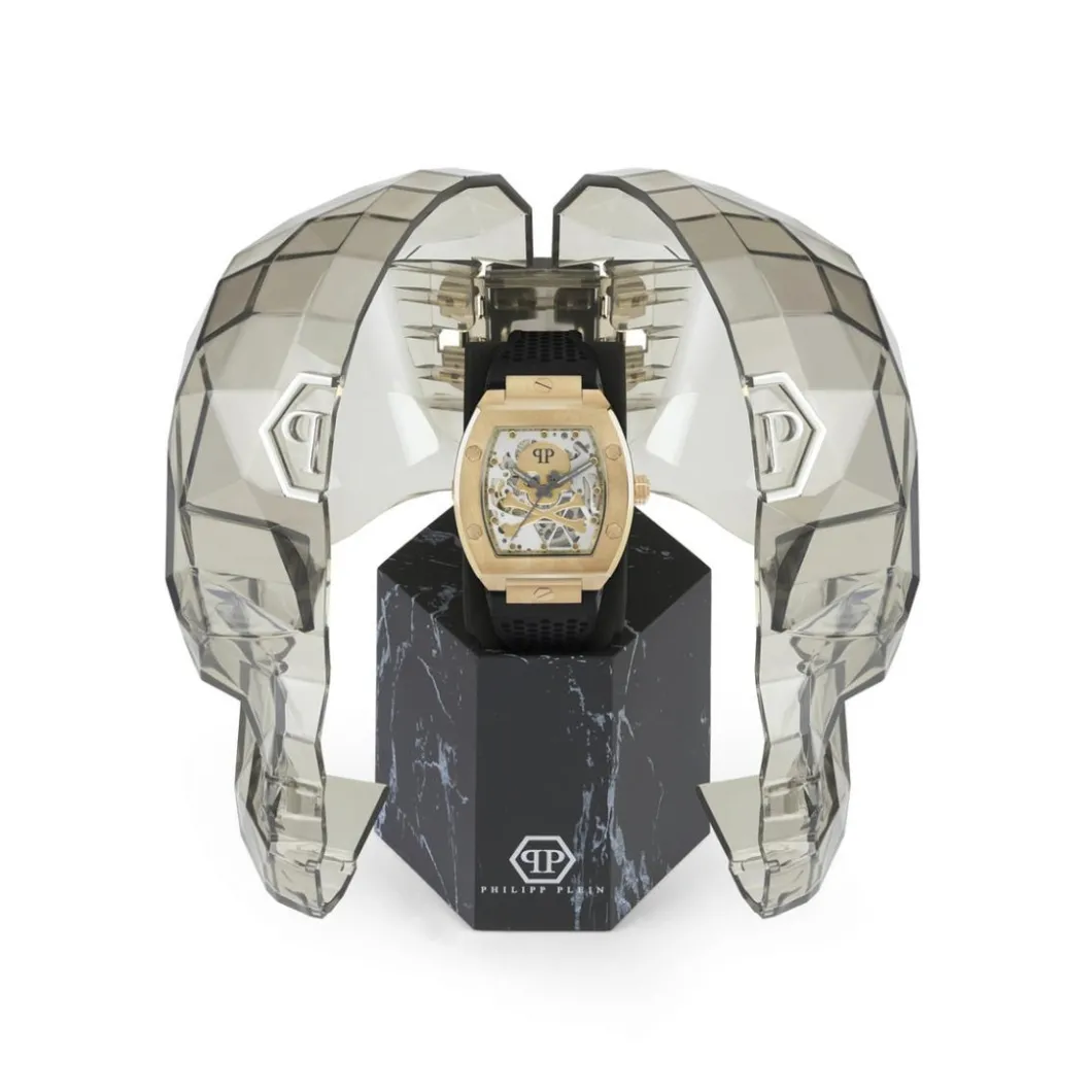 Cette Montre PWBAA0321 Philipp Plein HIGH-CONIC combine un bracelet perforé à un boîtier doré. Elle donne accès à un cadran analogique soigneusement décoré et à la finition squelettée.